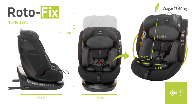 Fotelik Roto-fix i-Size to obrotowy fotelik wykonany zgodnie z najbardziej restrykcyjną homologacją R129. Gwarantuje to najwyższą ochronę dziecku o wzroście od 40 do 150 cm. Roto-fix jest zintegrowany z obrotową bazą 360° wyposażoną w system Isofix oraz pas Top Tether dzięki czemu jego monataż i użytkowanie jest niezwykle łatwe i szybkie.