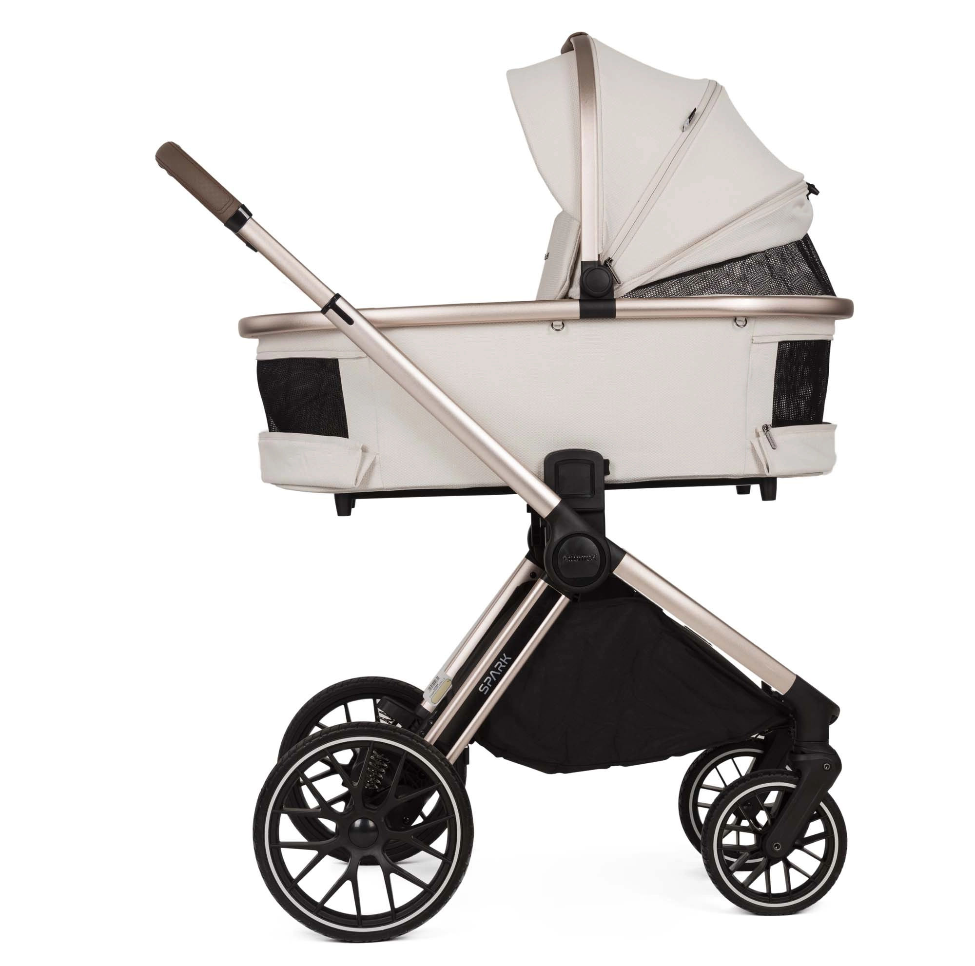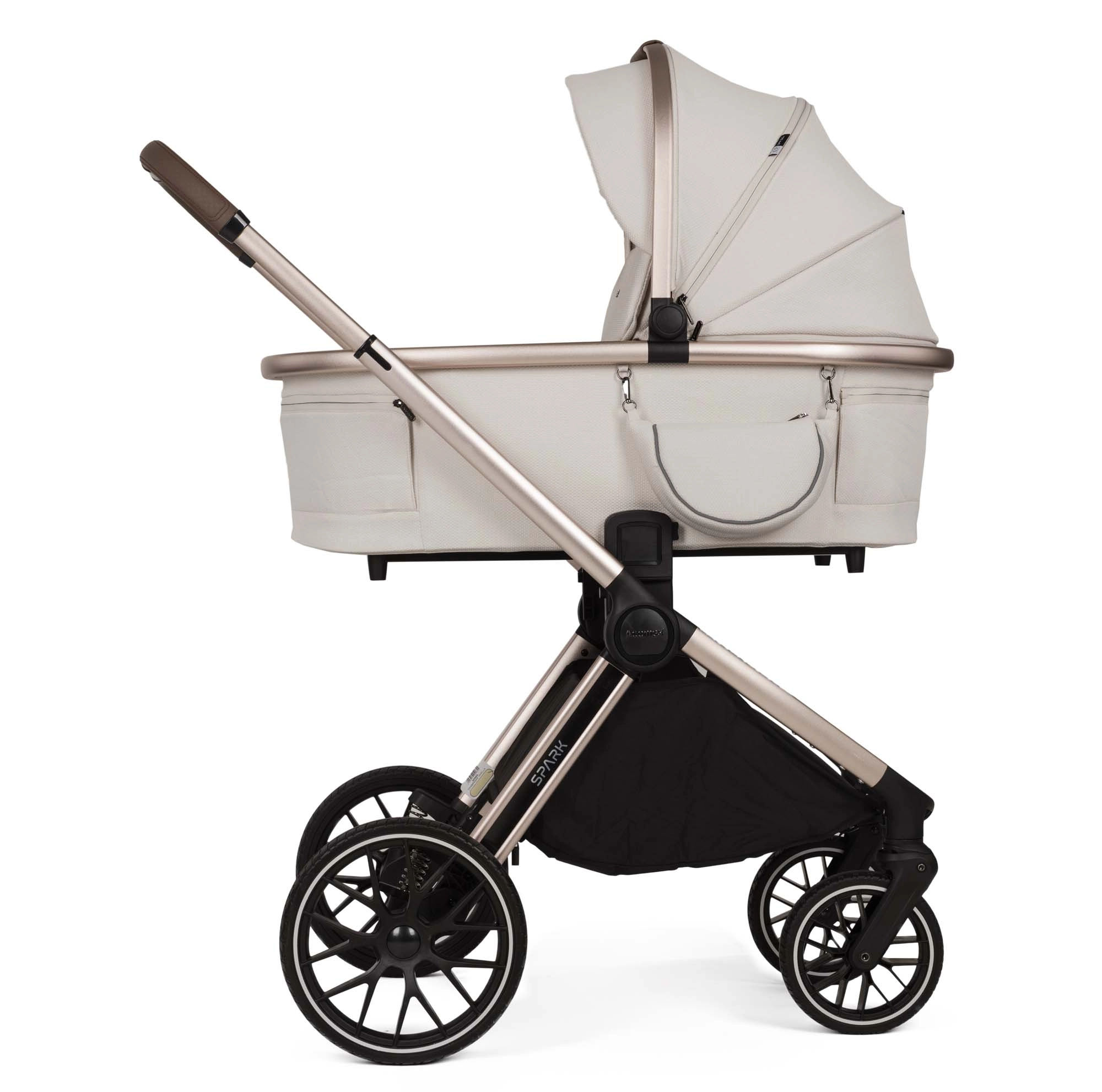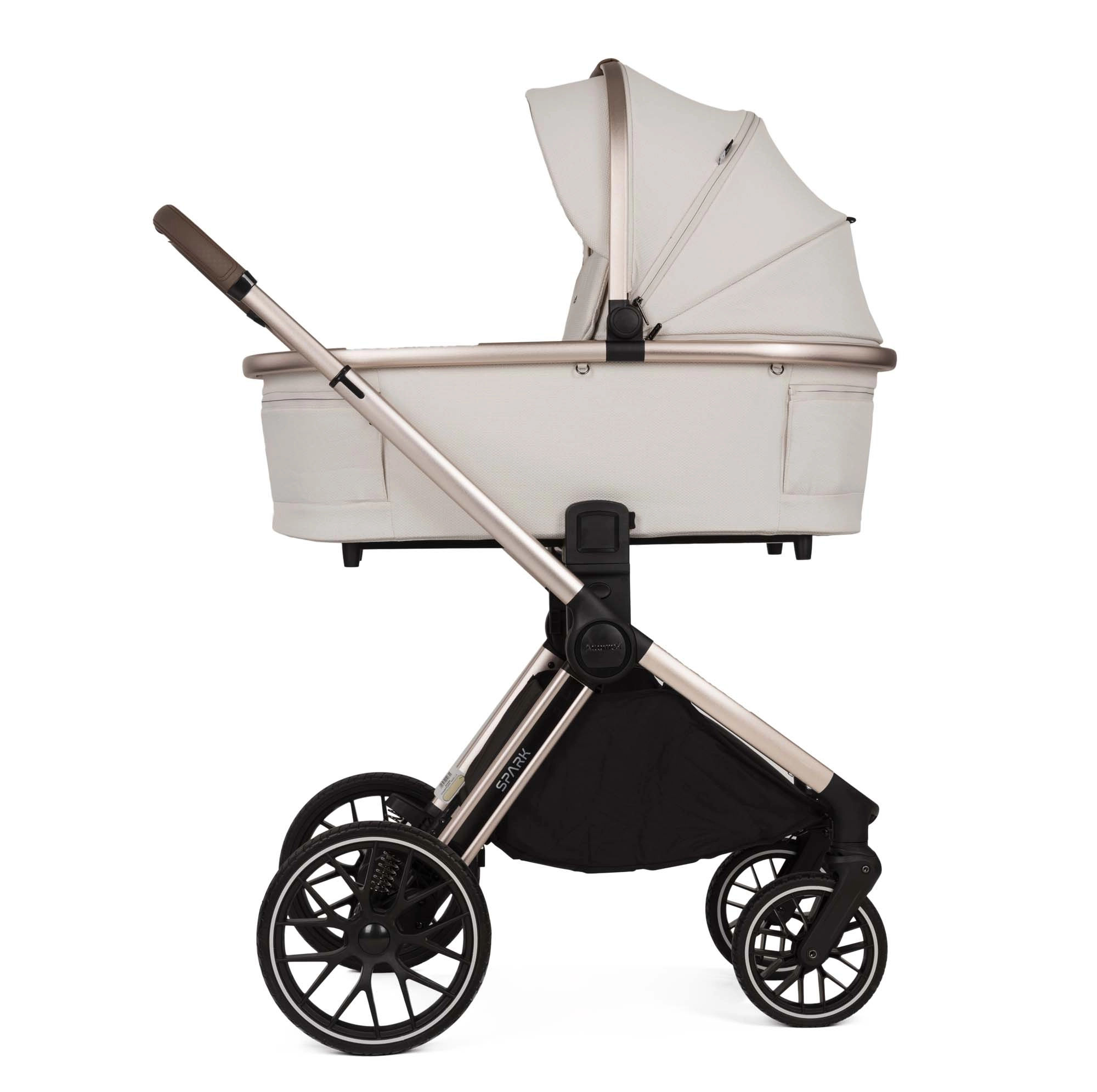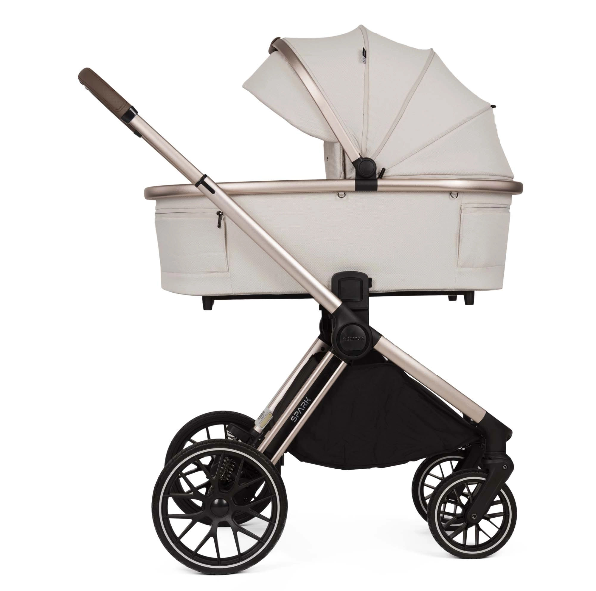 Wózek SPARK to model 2w1 charakteryzujący się funkcjonalnością oraz stylem. Został zaprojektowany z dbałością o najmniejsze detale, oferując wyjątkowy komfort zarówno dziecku, jak i rodzicom. W wersji Champagne wózek posiada anodowany stelaż w kolorze szampańskiego złota oraz eleganckie dodatki w kolorze ciemnego poleru.