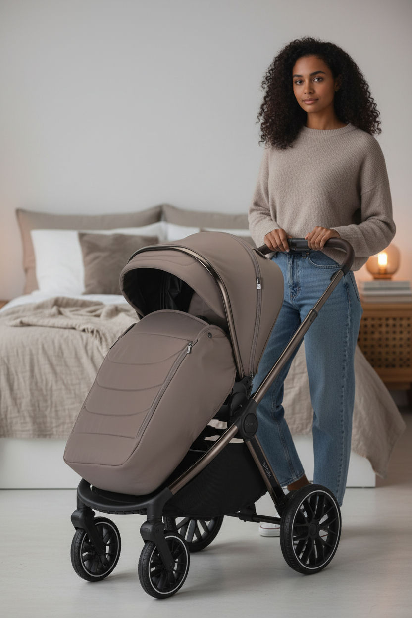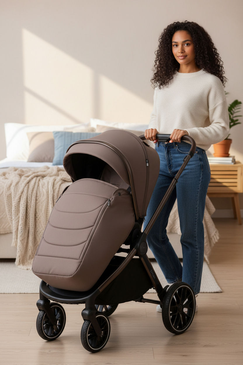Dzięki przedniej i tylnej amortyzacji wózek zapewnia komfortową jazdę po wszystkich nawierzchniach, a teleskopowa rączka z szerokim zakresem regulacji dostosowuje się do wzrostu każdego rodzica