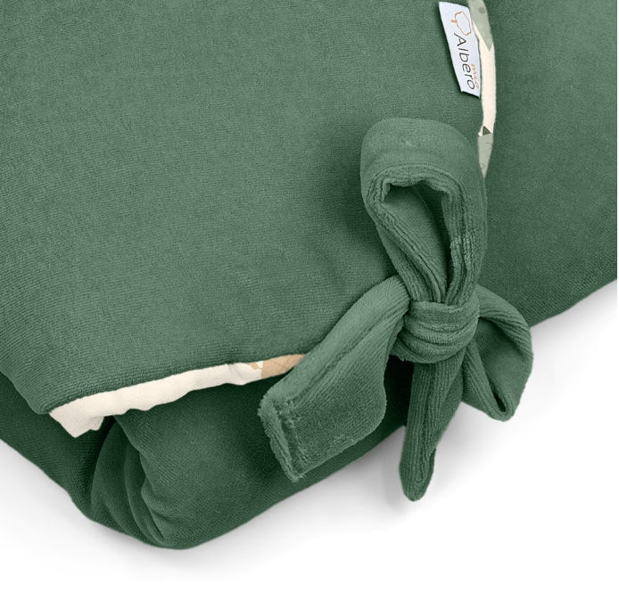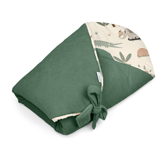 Satyna bawełniana, z której wykonany jest różek, to tkanina naturalna i przyjazna dla skóry dziecka. Posiada nadruk bawiących się zwierzątek pośród tropikalnych drzew, który dodaje produktowi wyjątkowego charakteru. Druga strona wykonana jest z miękkiego i przyjemnego w dotyku weluru bawełnianego. Rożek ma wszyte antyalergiczne wypełnienie, które w doskonały sposób izoluje ciepło i przepuszcza powietrze. Nie posiada dodatkowego usztywnienia, dzięki czemu zapewnia utrzymanie naturalnej i wygodnej dla noworodka pozycji. Wiązany na kokardę, pozwala na indywidualne dopasowanie rozmiaru rożka do wymiarów i potrzeb niemowlaka.