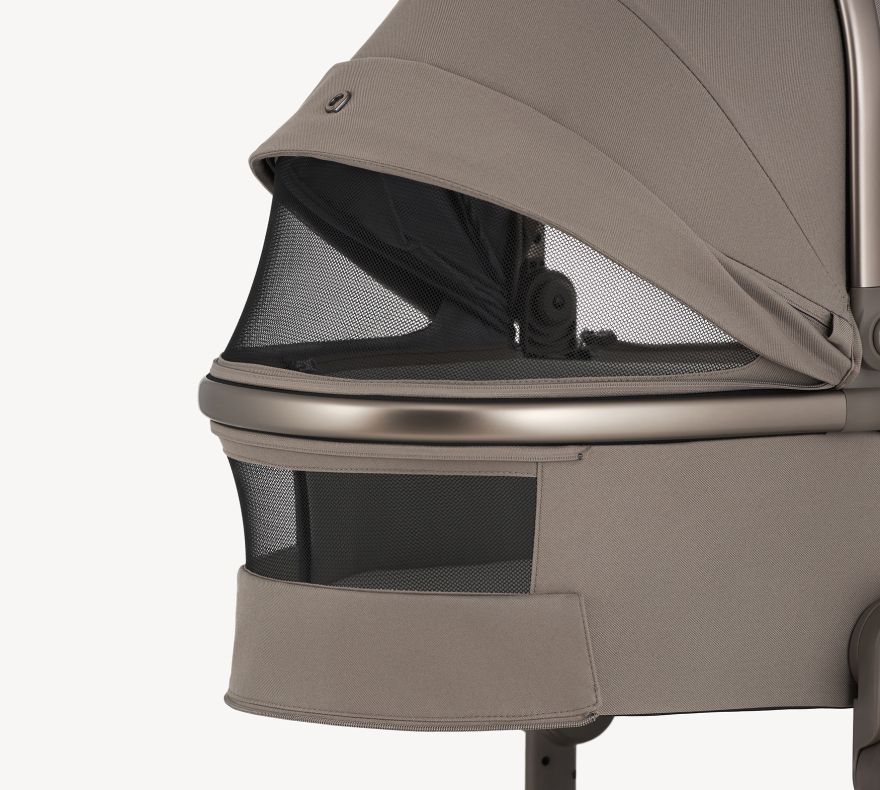 Przestronna gondola z gładkim dnem, wykonana z naturalnej tkaniny bambusowej, zapewnia komfortowe miejsce do spania dla noworodka.