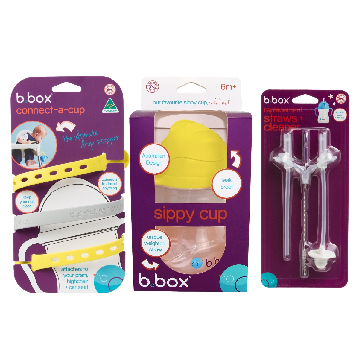 Zestaw na start 3w1 - bidon ze słomką 240 ml cytrynowy + smycz Lemon Sherbet + zapasowe słomki B.box