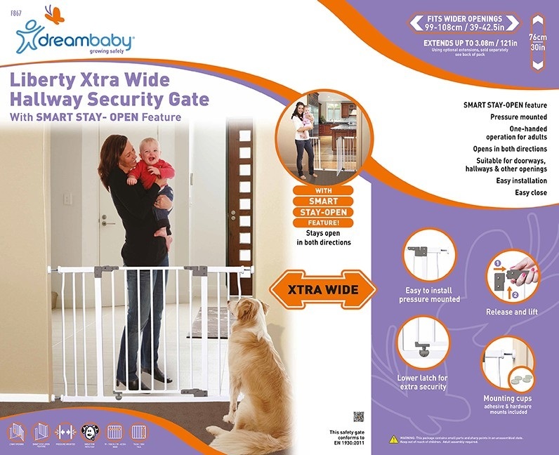 Poprzez użycie maksymalnie dwóch rozszerzeń Dreambaby, po jednej z każdej strony, bramka bezpieczeństwa może być poszerzona do 306 cm (w tym celu należy odnieść się do instrukcji bramki). Rozszerzenia nie wchodzą w skład wyposażenia bramki.