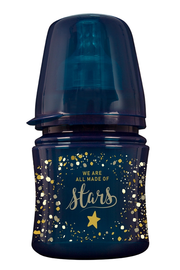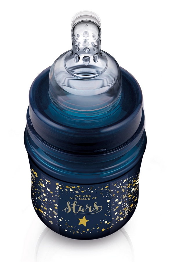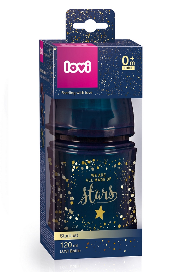 Butelka do podawania odciągniętego mleka mamy. Zdobiona dookoła w efektowne wzory zgodne z najnowszymi trendami.Bezpieczna dla dziecka karmionego piersią, gdyż nie zaburza odruchu ssania i nie koliduje z karmieniem naturalnym. Wyposażona w profesjonalny smoczek dynamiczny®zbudowany z niejednorodnych warstw silikonu (cienka, dynamiczna, wydłużająca się końcówka i twarda, profilowana podstawa). Dzięki temu wymaga od dziecka aktywnego ssania: silnej pracy mięśni warg i języka. Smoczek wyposażony jest w system odpowietrzania SUPERvent zapobiegający zasysaniu i zapadaniu się smoczka. Butelka jest kompatybilna z laktatorami LOVI.