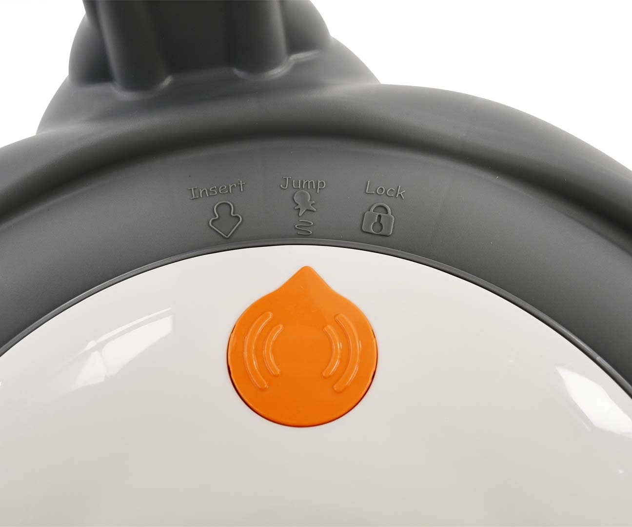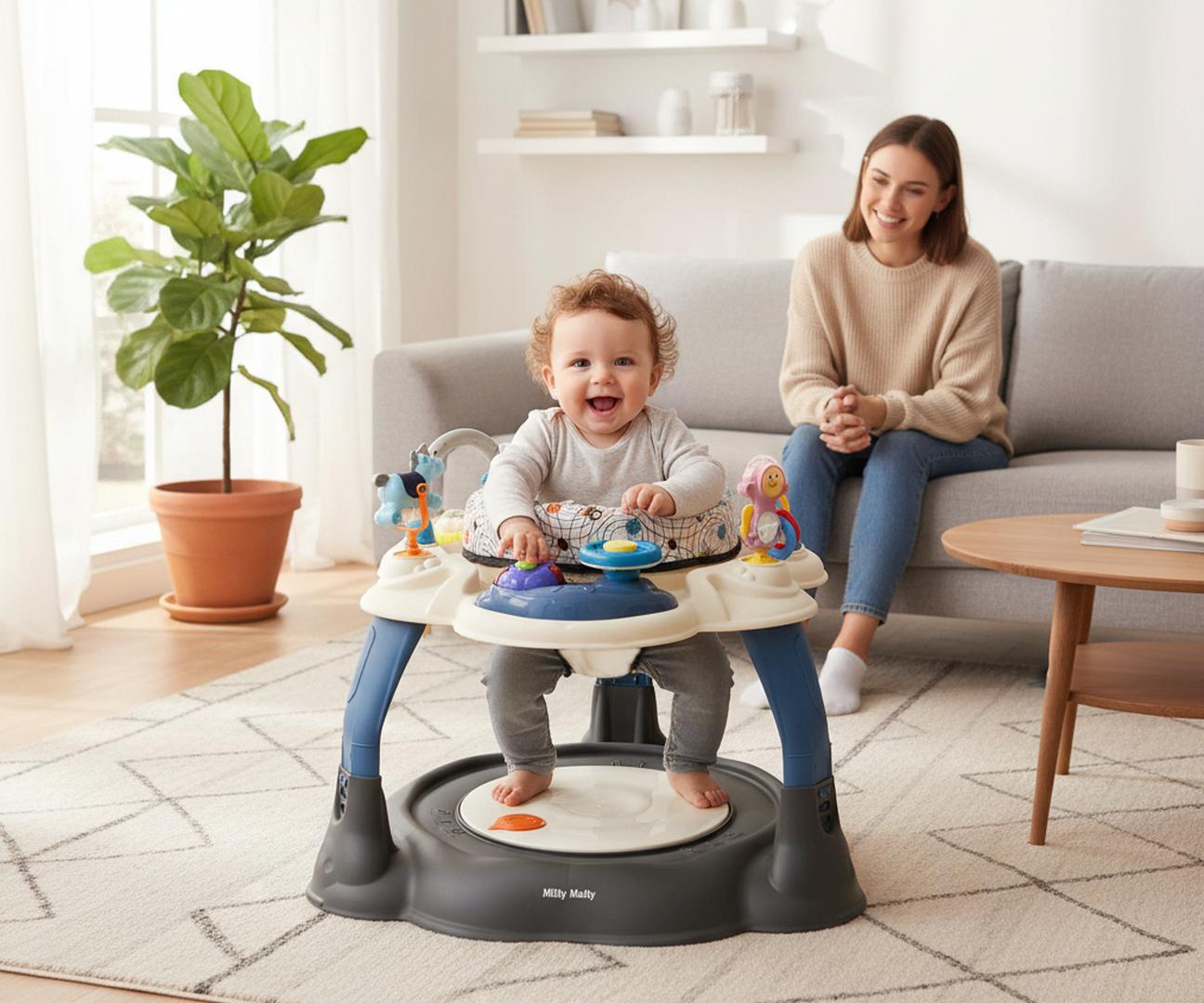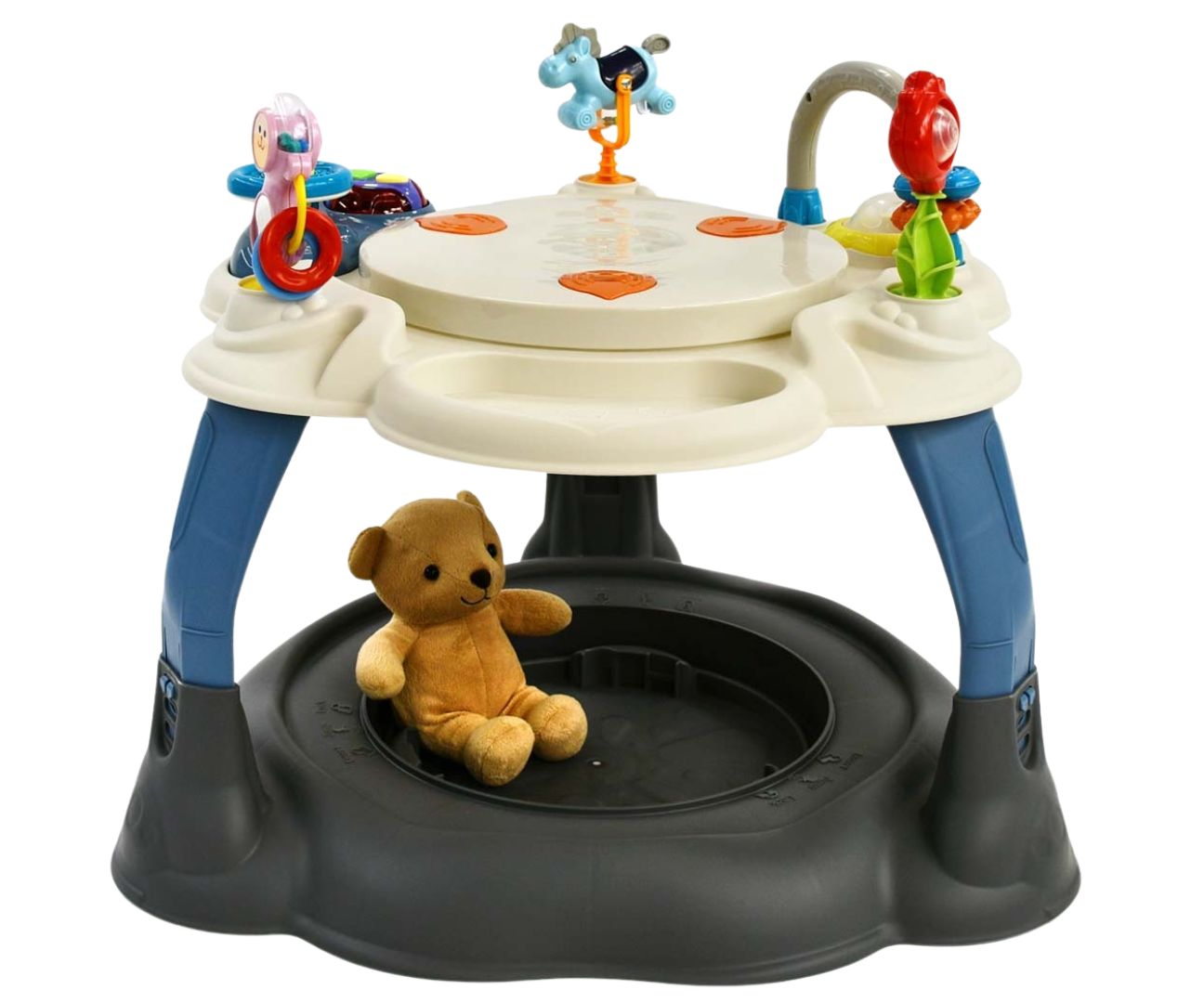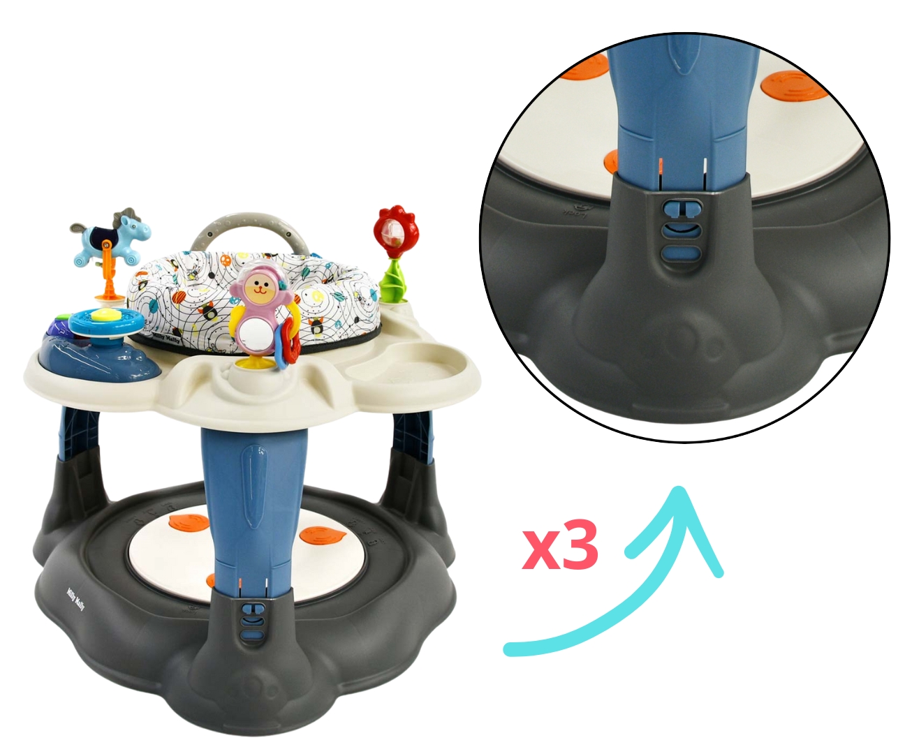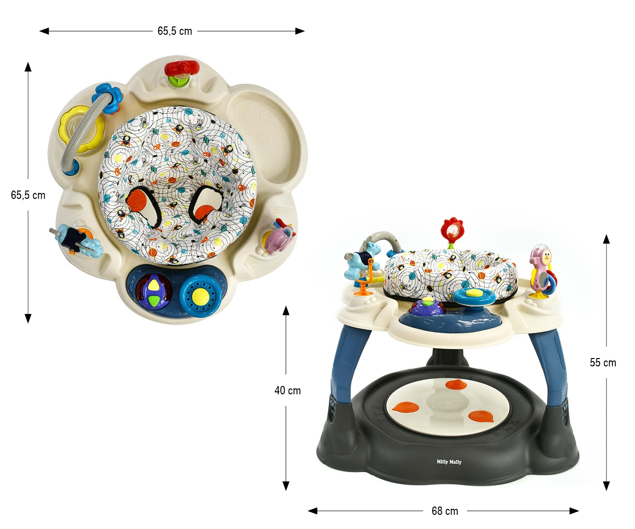Siedzisko obraca się o 360°, co umożliwia maluchowi dostęp do wszystkich atrakcji znajdujących się na blacie. Ruchome elementy, różnorodne faktury i żywe kolory stymulują zmysły dziecka, rozwijając jego koordynację wzrokowo-ruchową oraz zdolności manualne. Wśród zabawek znajdują się m.in. grzechotki, obrotowe figurki i elementy dźwiękowe, które zachęcają do odkrywania i eksperymentowania.
