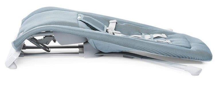 Siedzisko leżaczka wykonane zostało z miękkiej tkaniny, która zapewnia idealne podparcie dla kręgosłupa ale też jest przewiewna. W siedzisku zastosowano też pasy bezpieczeństwa oraz szeroki pas krokowy.