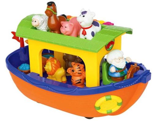 Wspaniała arka Noego zawiera 9 zwierzątek, które nagrodzą dzieci realistycznymi odgłosami bądź zabawną rymowanką za każdym razem, gdy odgadną prawidłowy kształt i umieszczą je w odpowiednim miejscu. Ster arki po przekręceniu wydaje realistyczne dźwięki. Zabawka posiada kolorowe mini pianinko, na którym można zagrać własną kompozycję. Istnieje możliwość doczepienia sznureczka do arki za pomocą którego może być prowadzona przez maluszka. Arka podczas jazdy imituje ruchy „płynącej na falach łodzi”.