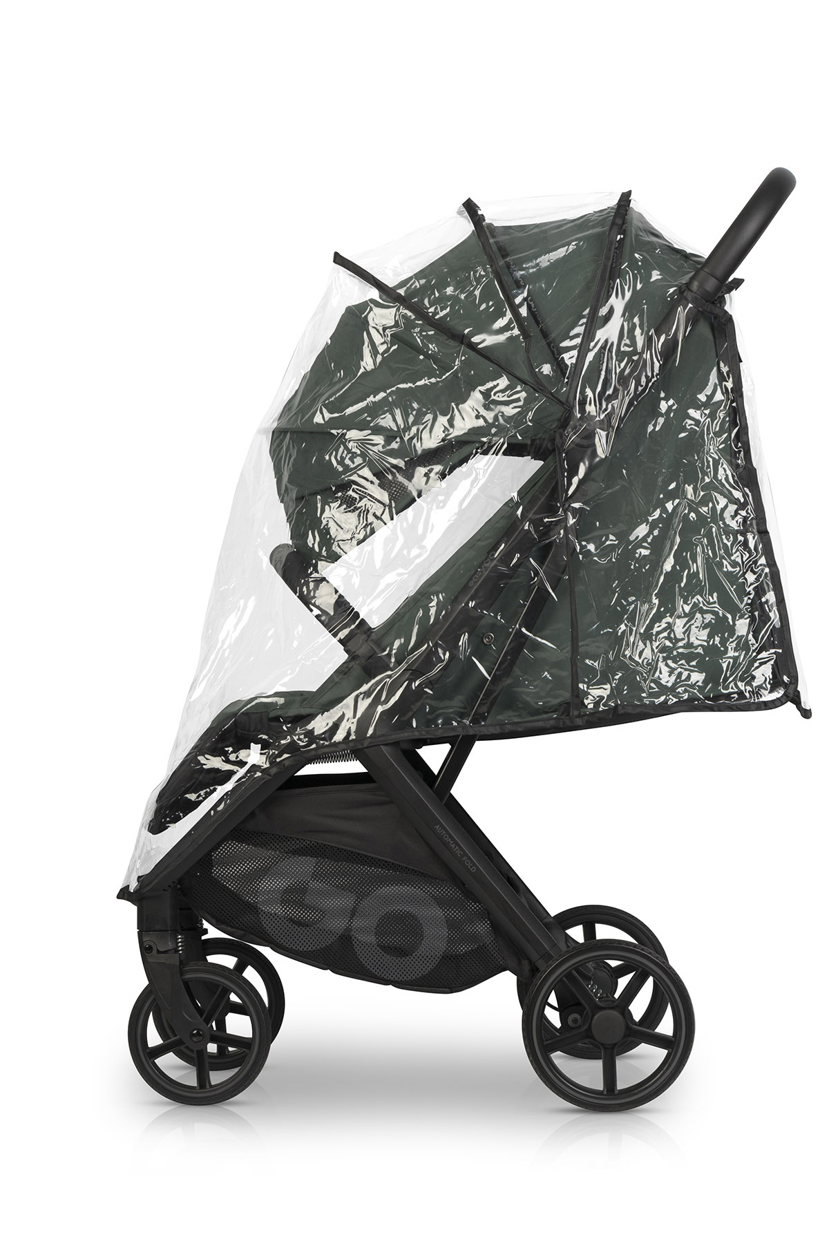 W zestawie z wózkiem znajduje się pełna folia przeciwdeszczowa z wywietrznikami na wysokości twarzy dziecka, wygodny pokrowiec na nóżki (ocieplacz), pojemy koszyk oraz praktyczny pokrowiec transportowy, który pomieści złożony wózek razem z kołami.