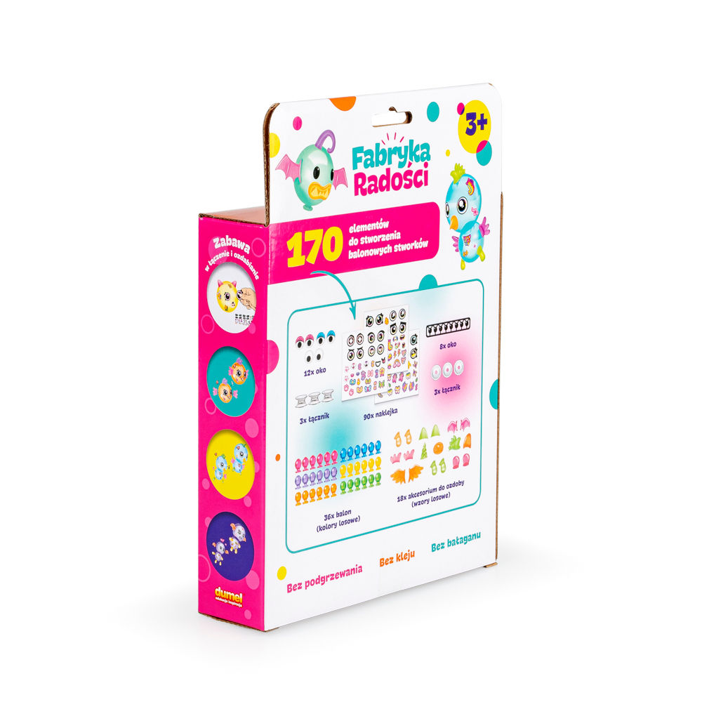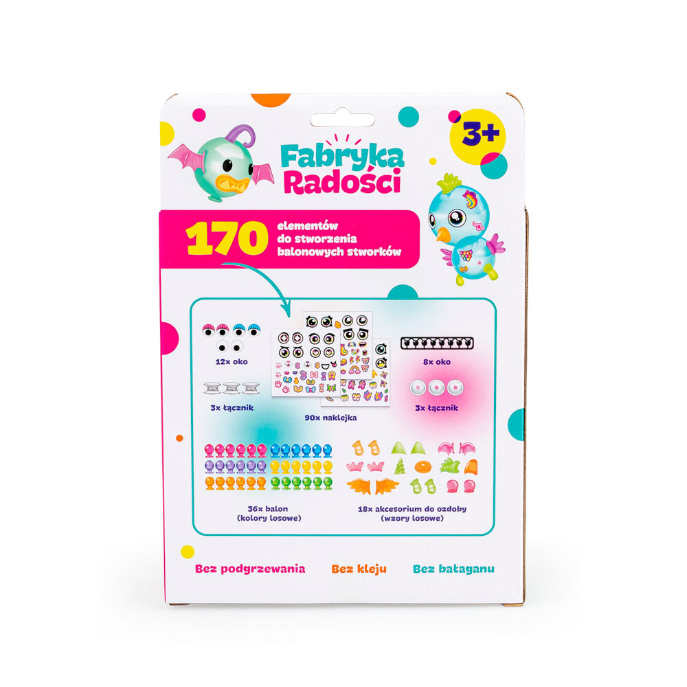 - w zestawie 170 elementów do stworzenia balonowych stworków (w tym: 36 balonów, 90 naklejek i 44 akcesoria do stworzenia i ozdoby gotowych stworków);