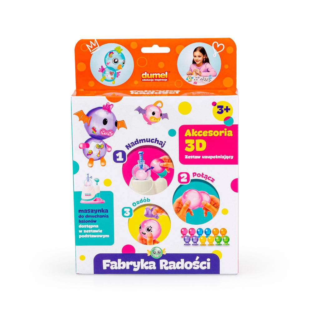 Przeżyj balonową przygodę z trójwymiarowymi akcesoriami! Zestaw akcesoriów 3D to uzupełnienie do zestawu podstawowego, Fabryka Radości – Balony. Znajdziesz w nim aż 170 elementów, a wśród nich nie tylko balony, ale też naklejki oraz trójwymiarowe ozdoby, takie jak skrzydełka, uszka czy łapki, z którymi „wyczarujesz” kolejne, balonowe stworki.