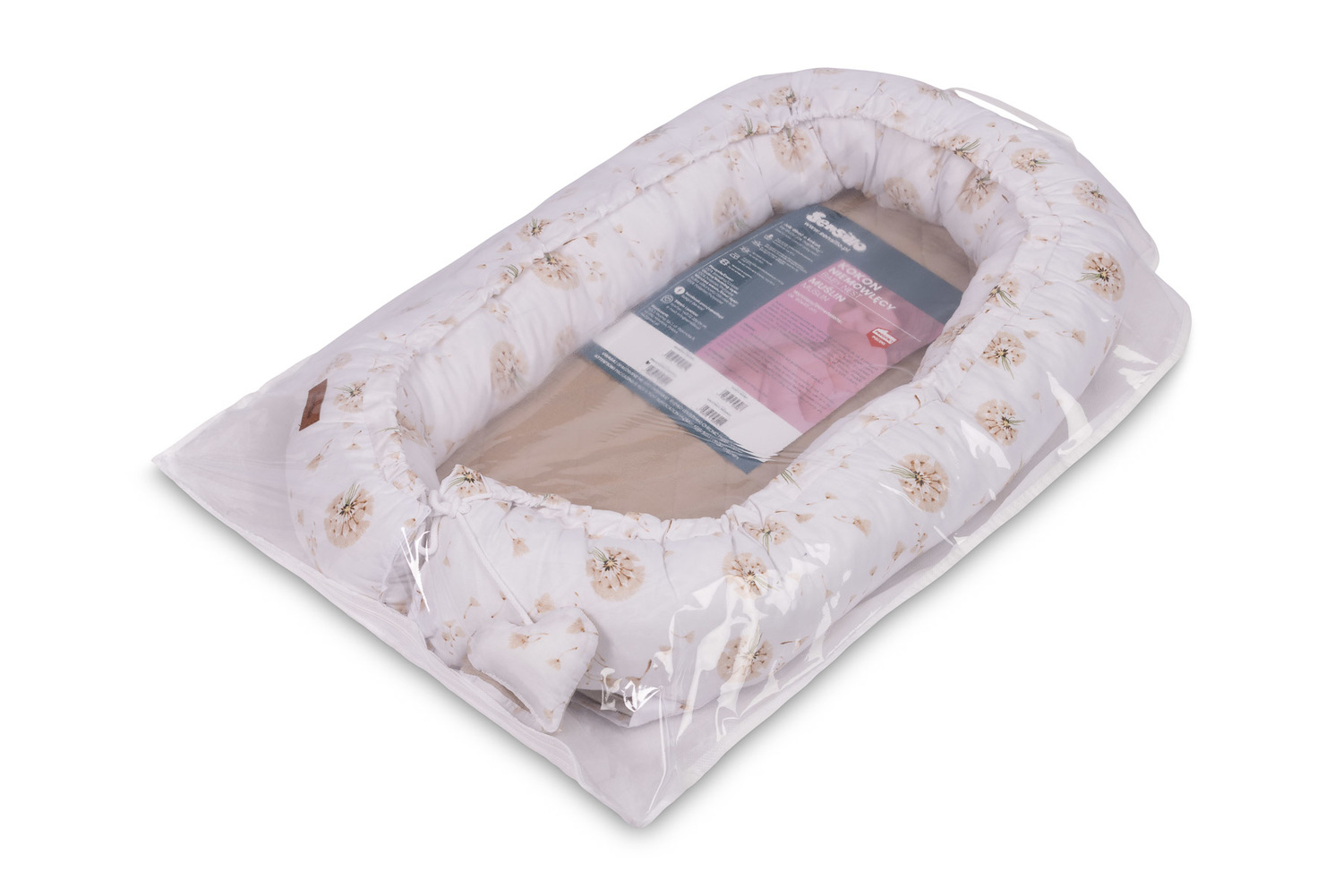 Podstawę kokonu stanowi wyjmowany materacyk, który z jednej strony pokryty jest tkaniną muślinową, a z drugiej delikatną bawełną z uroczym nadrukiem. Dzięki temu można dostosować stronę materacyka do zmieniających się potrzeb dziecka i warunków otoczenia.