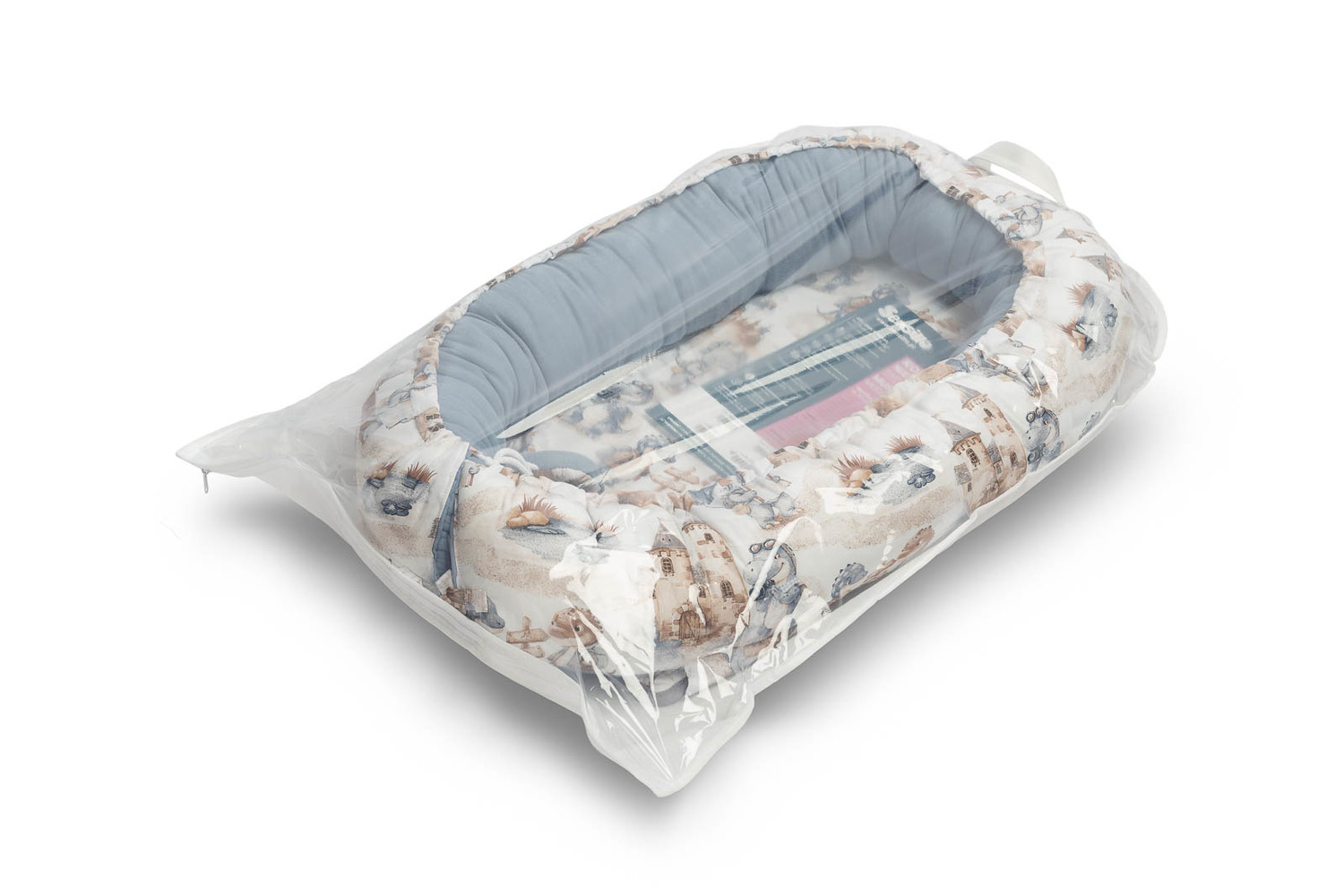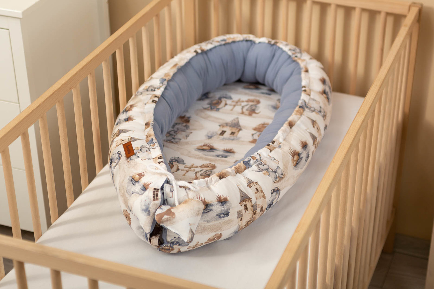 Kokon oferuje maluszkowi bezpieczne i przytulne miejsce zarówno do snu, jak i odpoczynku, skutecznie chroniąc przed przypadkowymi upadkami i sturlaniem się. Wypełnienie antyalergiczne oraz tkaniny przyjazne dla delikatnej skóry niemowlęcia zapewniają spokojny sen oraz zdrowe środowisko.