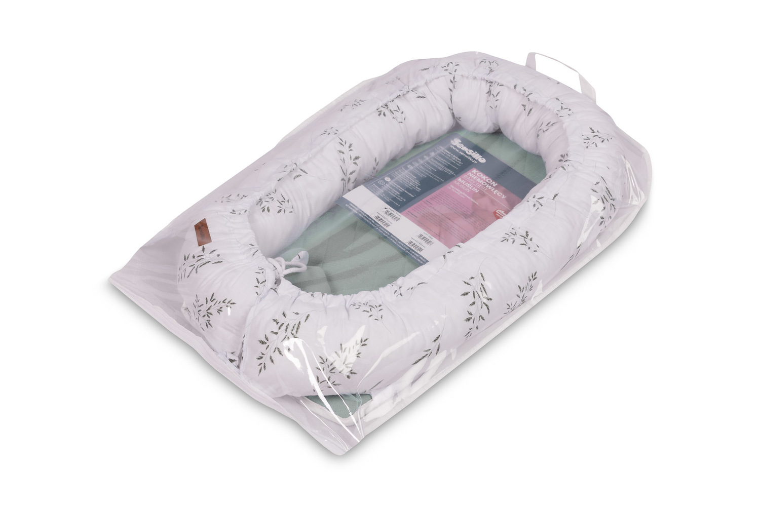 Podstawę kokonu stanowi wyjmowany materacyk, który z jednej strony pokryty jest tkaniną muślinową, a z drugiej delikatną bawełną z uroczym nadrukiem. Dzięki temu można dostosować stronę materacyka do zmieniających się potrzeb dziecka i warunków otoczenia.