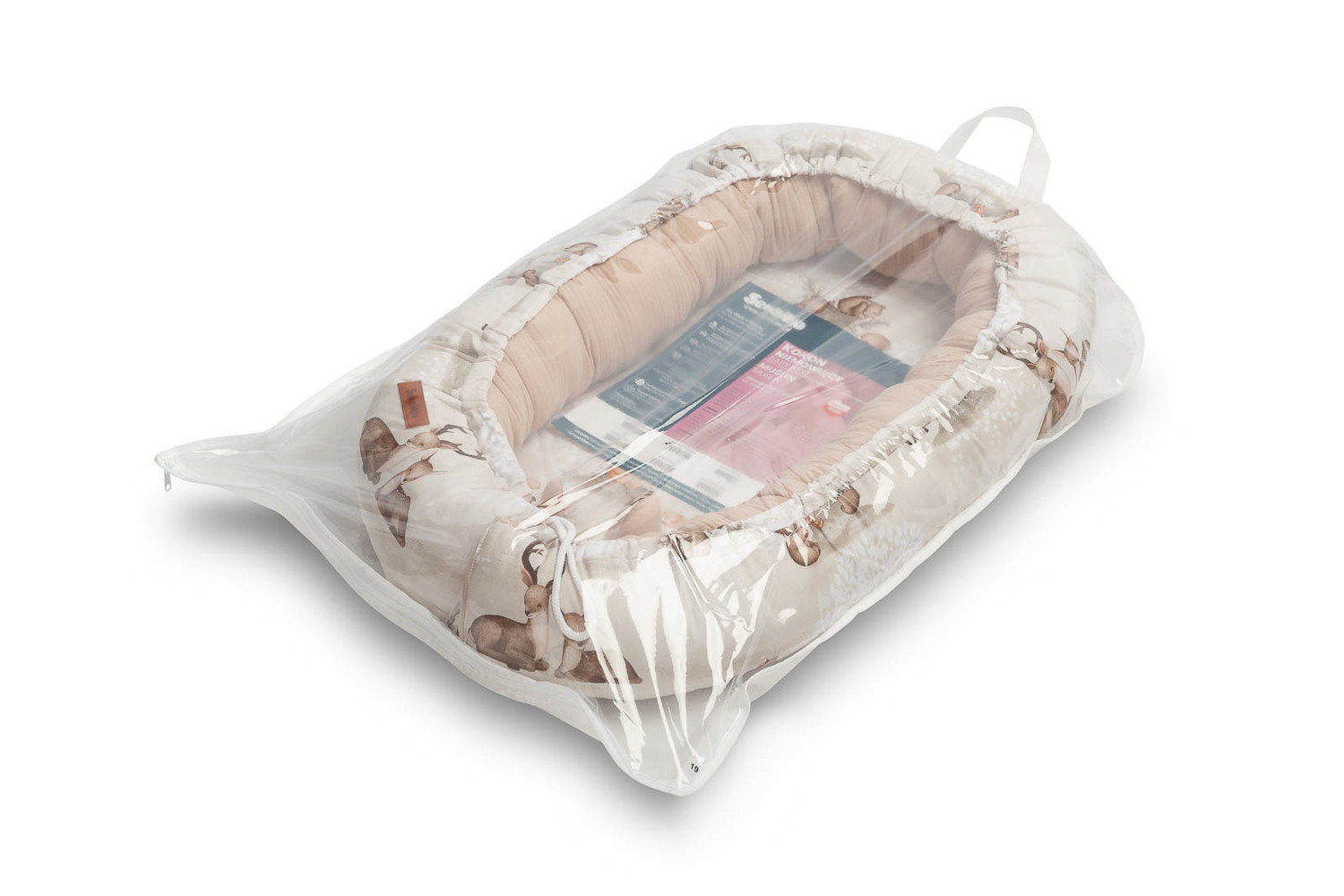 Podstawę kokonu stanowi wyjmowany materacyk, który z jednej strony pokryty jest tkaniną muślinową, a z drugiej delikatną bawełną z uroczym nadrukiem. Dzięki temu można dostosować stronę materacyka do zmieniających się potrzeb dziecka i warunków otoczenia.