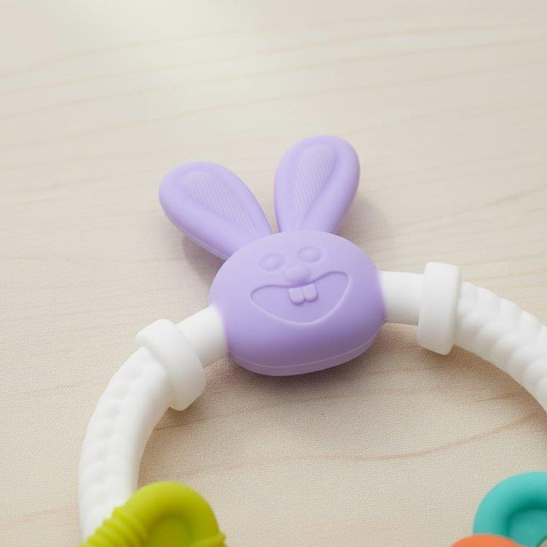 Centrum gryzaka stanowi fioletowa główka króliczka z długimi uszami, które idealnie nadają się do masowania dziąseł w tylnej części buzi. Biała, elastyczna obręcz posiada unikalną fakturę skręconego sznura, co zapewnia dodatkową stymulację sensoryczną przy każdym dotyku i gryzieniu.