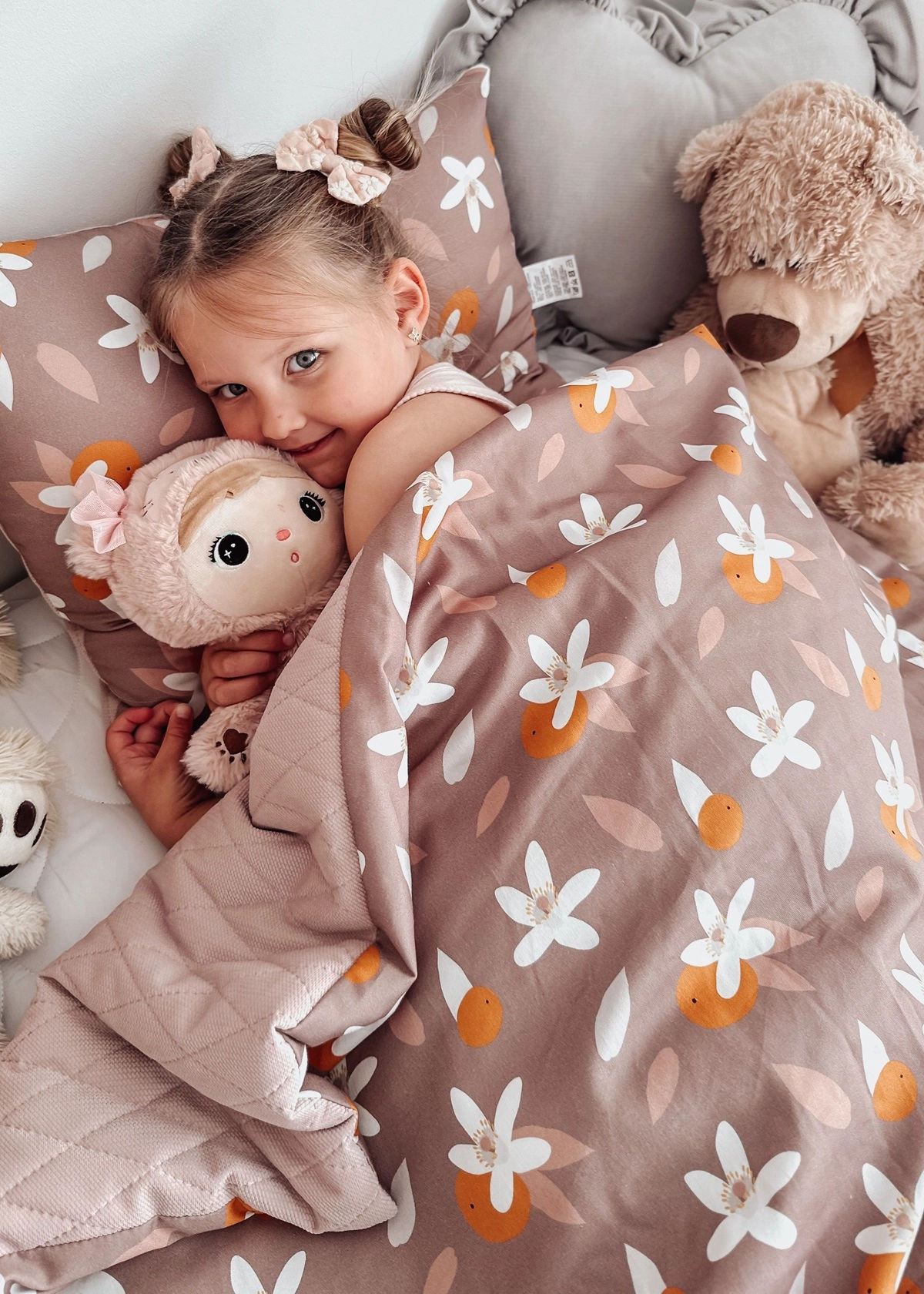 Duży kocyk (100×135 cm) – z jednej strony miękki velvet pikowany, z drugiej oddychająca bawełna w pięknych, dziecięcych wzorach.
