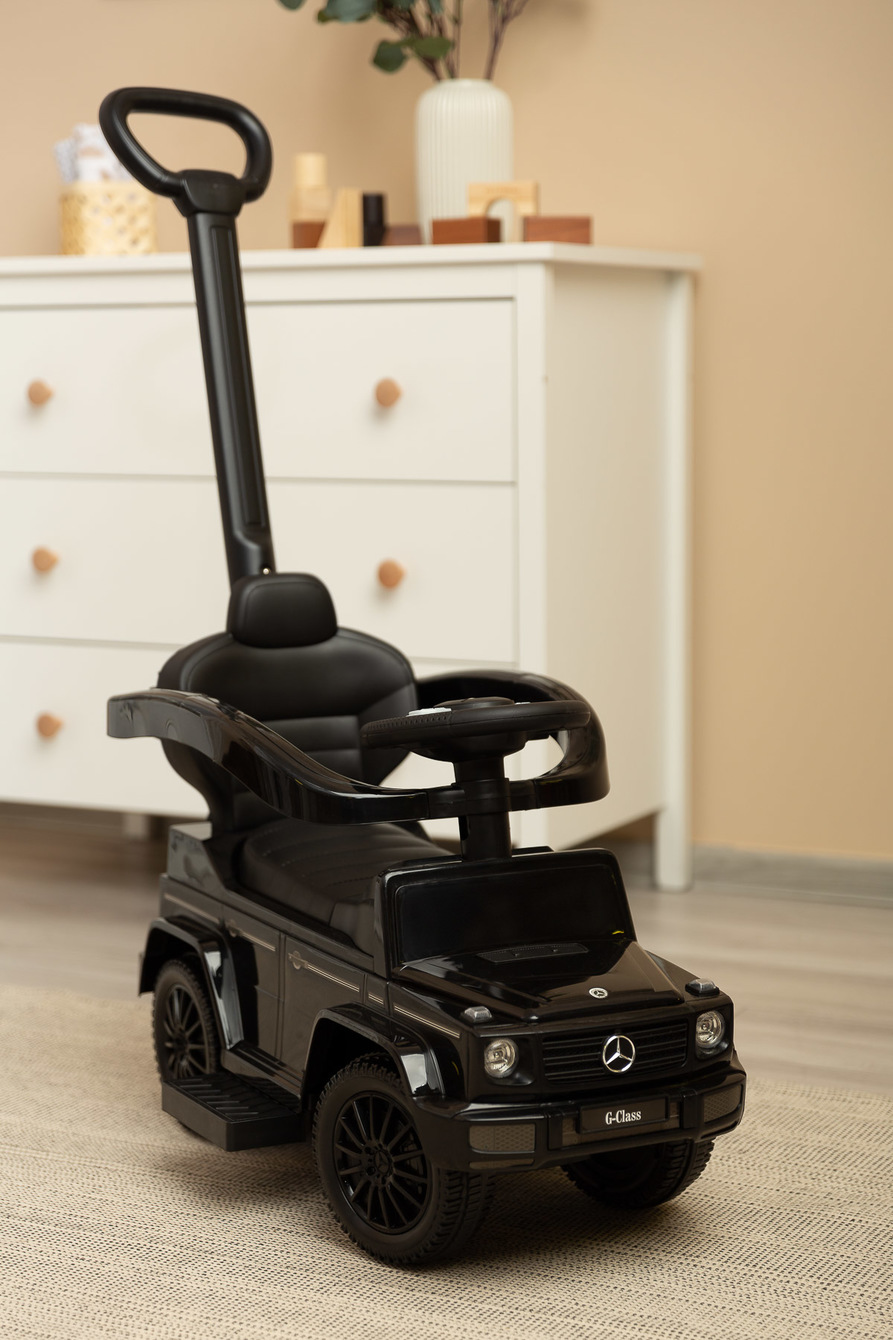 Pojazd Mercedes G 350 D od Toyz to licencjonowany jeździk, chodzik i pchacz w jednym. Swoim wyglądem odzwierciedla wygląd samochodów kultowej klasy G. Korzystając z otwieranych barierek, wysuwanych podnóżków i rączka do prowadzenia pojazd staje się pchaczem przeznaczonym dla najmłodszych pociech. Rodzic demontując poszczególne elementy może go w szybki sposób przekształcić w jeździk, którym będzie się samodzielnie poruszać dziecko. Jazdę Mercedesem urozmaici kierownica z efektami dźwiękowymi. Natomiast rodzice docenią znajdujący się pod siedziskiem schowek.