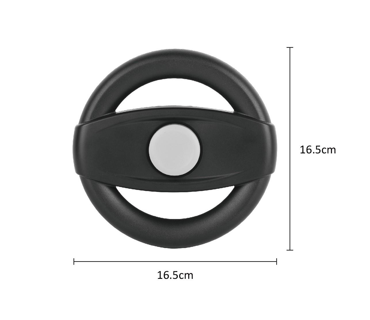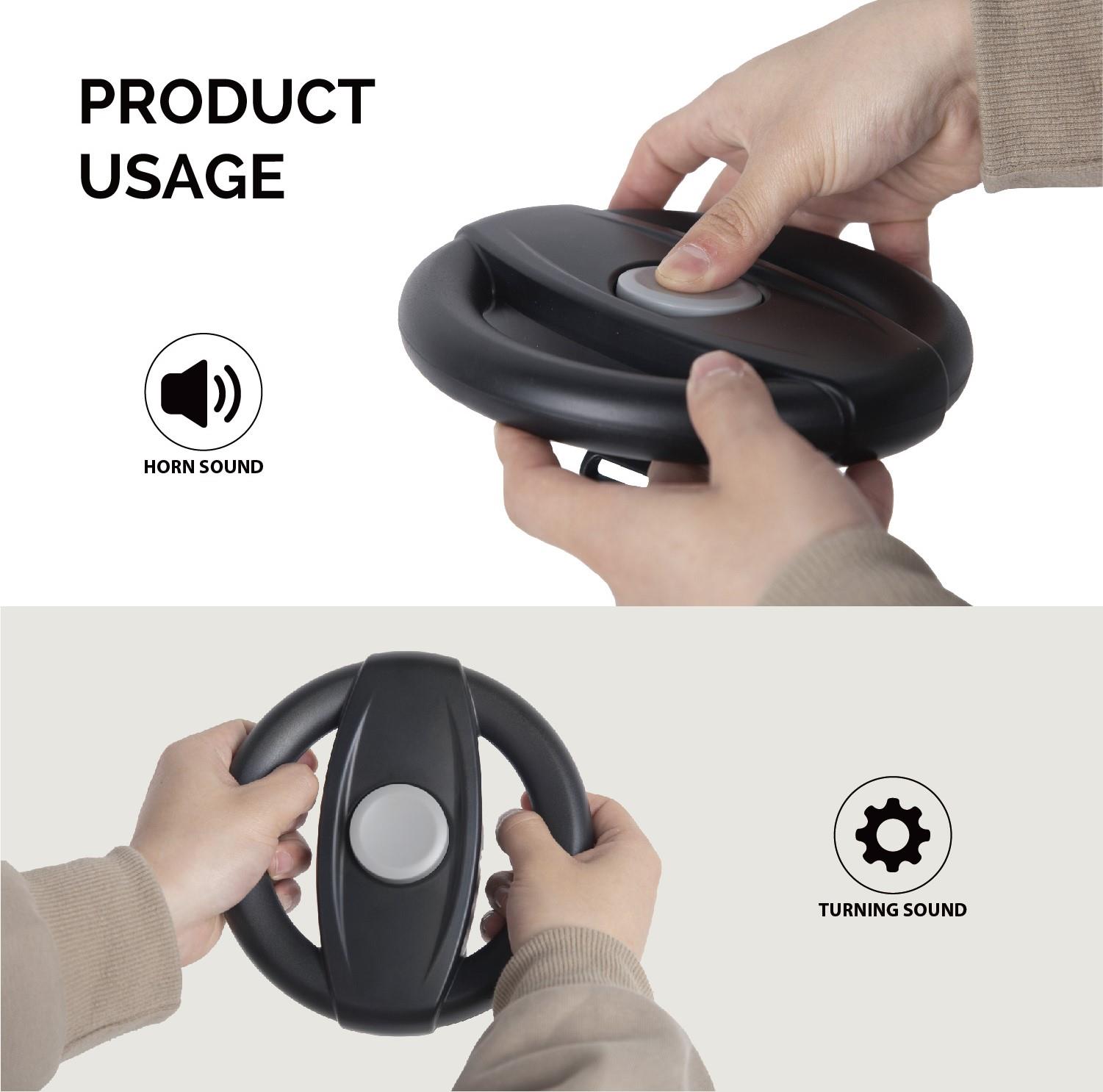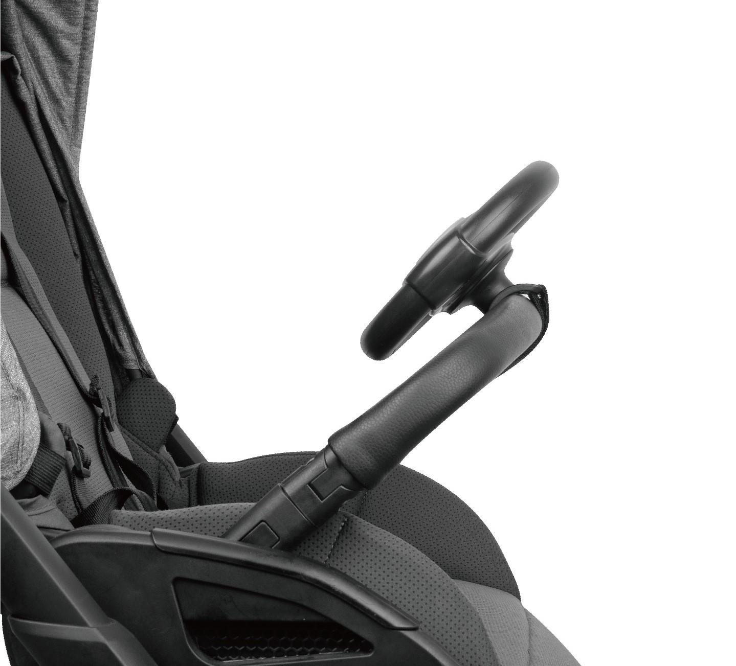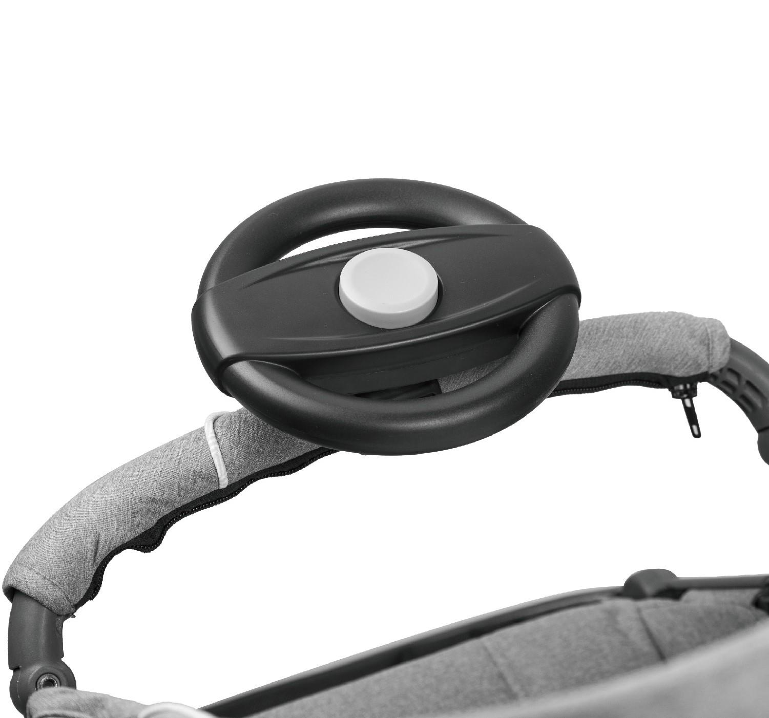 Kierownica jest czarna, estetycznie wykonana, wyposażona w jaśniejszy klakson, antypoślizgowa i profilowana tak, by była poręczna dla dziecięcych rączek. Na barierce sprawdzi się jako wesoła rozrywka dla małego pasażera, zamontowana na rączce może być atrakcją dla starszego rodzeństwa, np. jadącego na podstawce. Kierownica jest łatwa do utrzymania w czystości, wystarczy umyć ją wilgotną szmatką.