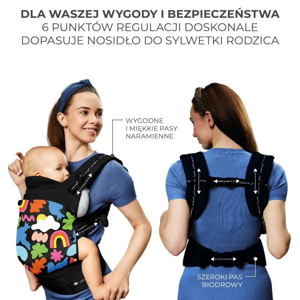 Pasy naramienne w tym nosidełku są tak zaprojektowane, aby gwarantować miękkość i komfort noszenia nawet podczas najdłuższych wycieczek. Dodatkowo są regulowane, więc łatwo dopasujesz je do swojej sylwetki, tak aby zagwarantować wygodę sobie i bezpieczeństwo i komfort dziecku. Miękkie osłonki znajdujące się pod pasami nosidełka zapewniają wygodę i chronią przez obtarciami.