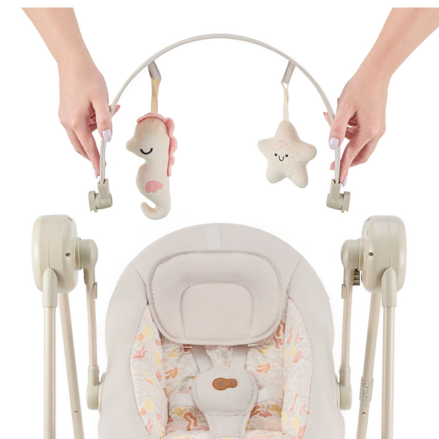 SWINGEE zapewnia 5 poziomów regulacji prędkości bujania oraz timer z 3 ustawieniami czasu (8, 15 i 30 minut). To rozwiązanie wspiera spokojny sen dziecka i daje rodzicom chwilę na odpoczynek. Pałąk z zabawkami oraz 8 relaksacyjnych melodii z regulacją głośności stymulują zmysły i pozytywnie wpływają na rozwój sensoryczny najmłodszych.