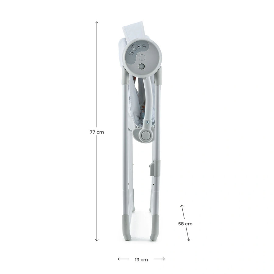 Kompaktowe wymiary po złożeniu oraz niska waga – tylko 3,7 kg sprawiają, że SWINGEE doskonale sprawdzi się w małych mieszkaniach i podczas podróży. Ergonomoczne siedzisko, regulowana poduszka i 5-punktowe pasy bezpieczeństwa z osłonkami gwarantują wygodną i bezpieczną przestrzeń do relaksu.