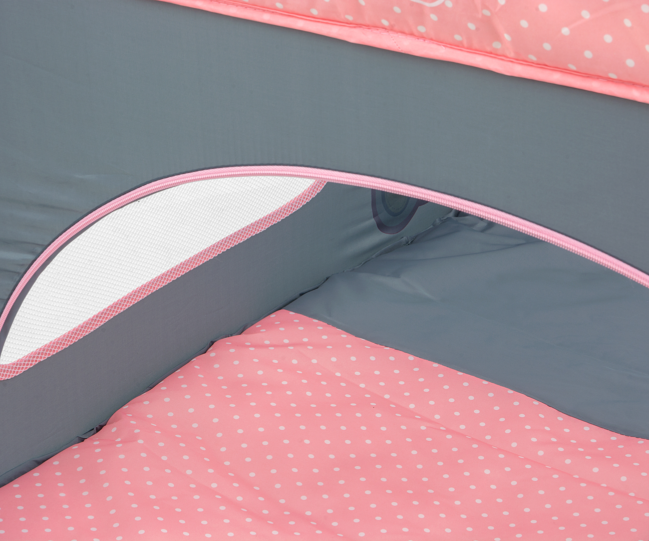 Boki łóżeczka zostały wykonane z mocnej siateczki, która zapewnia odpowiednią cyrkulację powietrza. Ponadto wpływają pozytywnie na poczucie bezpieczeństwa, dziecko podczas zabawy widzi rodziców – zatem spokojnie się bawi, jednocześnie będąc pod nadzorem rodzica.