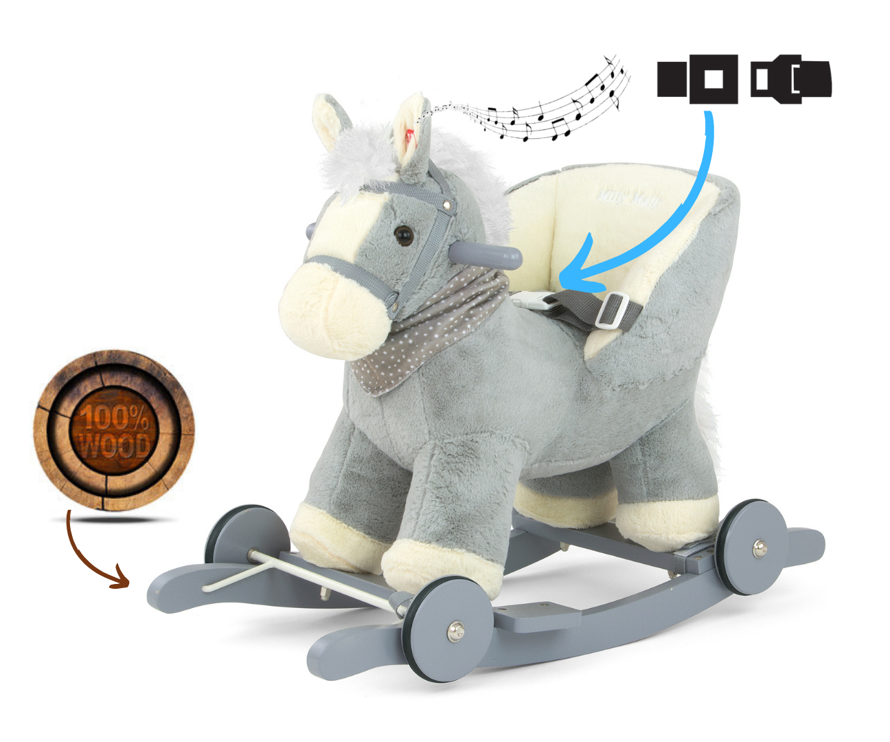 Konik posiada drewniane bieguny z podnóżkami i rączki, które pomogą zachować równowagę podczas zabawy oraz zestaw składanych kółek, dzięki którym w kilka sekund można zamienić go w cudowny pluszowy pojazd.