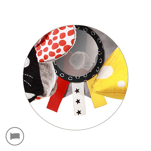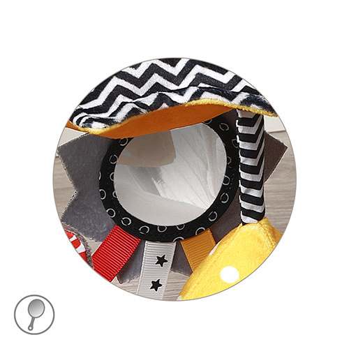 Wystające tasiemki w kontrastowych barwach i z geometrycznymi wzorami przyciągają wzrok. Mają ciekawą fakturę, która zachęca do dotyku. Dziecko chętnie wyciąga do nich rączki, ćwicząc swój chwyt.