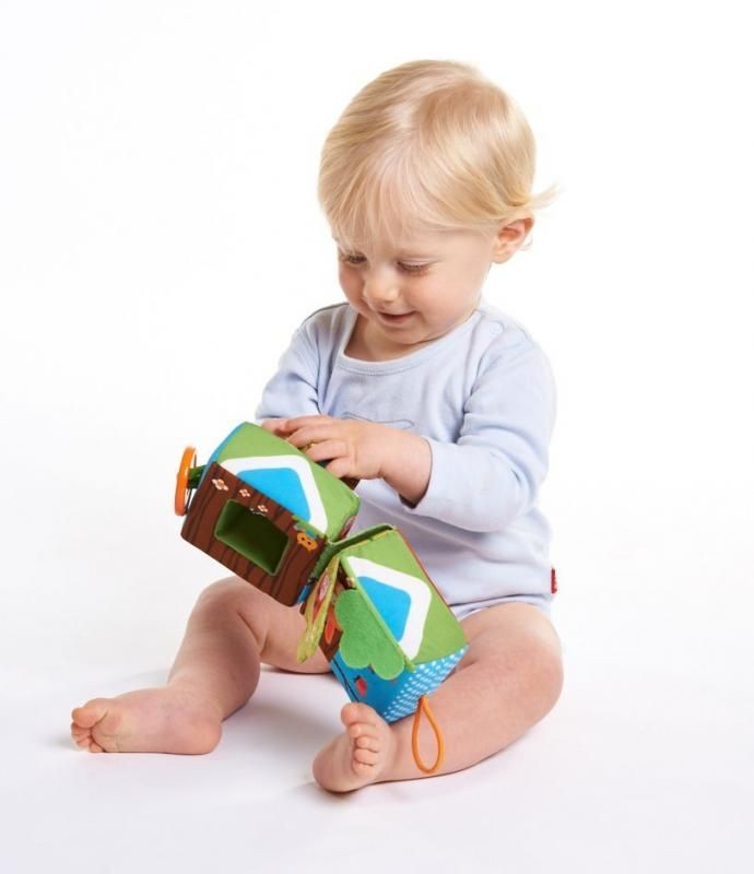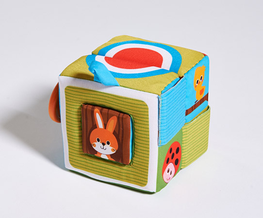 Pozwól dziecku bawić się bardziej zaawansowanymi cechami miękkiej kostki. Pozwól wyciągać wewnętrzną kostkę i wkładać. Zamykać kostkę używając pętelki.