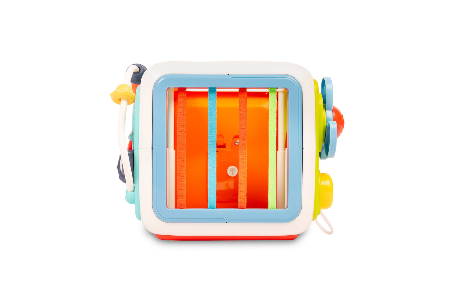 Kostka sensoryczna wspiera logiczne myślenie dziecka poprzez zabawę z dwoma różnymi sorterami. Jedna ze ścianek wyposażona jest w cztery elastyczne sznurki, przez które dziecko może przeciągać i wrzucać klocki – to świetne ćwiczenie dla paluszków, rozwijające precyzję ruchu i cierpliwość. Druga ścianka zawiera klasyczny sorter z różnymi kształtami, który uczy rozpoznawania form, logicznego myślenia i dopasowywania elementów.