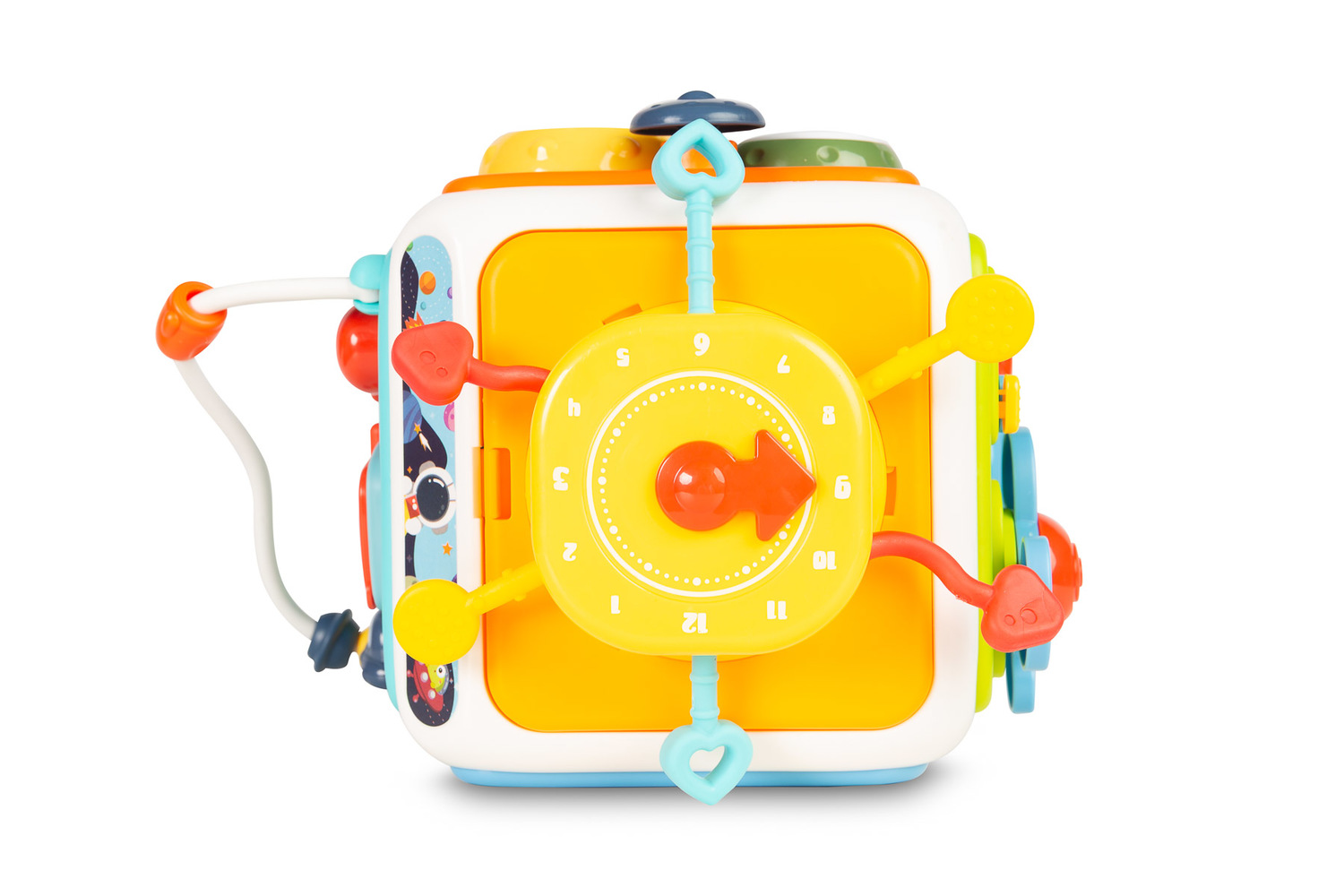 Kostka sensoryczna została zaprojektowana tak, by wspierać rozwój małej motoryki u najmłodszych. Obrotowe kształty zachęcają do chwytania i kręcenia, co rozwija siłę dłoni i precyzję ruchów. Labirynt z koralikami to doskonałe ćwiczenie koordynacji ręka–oko i cierpliwości – przesuwanie elementów po torze rozwija koncentrację oraz zdolność planowania ruchu przygotowując dziecko do dalszych etapów rozwoju, takich jak rysowanie, zapinanie guzików czy trzymanie sztućców.