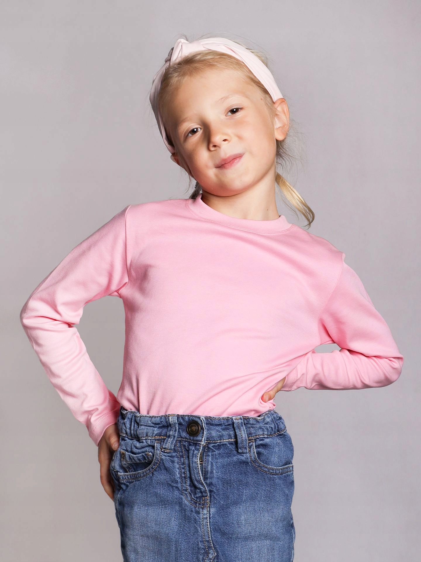 Dziewczęca bluzka w kolorze różowym. Posiada klasyczny, okrągły dekolt oraz długie rękawki. Delikatne taliowanie sprawia, że zgrabnie leży na dziecku, jednocześnie go nie opinając.