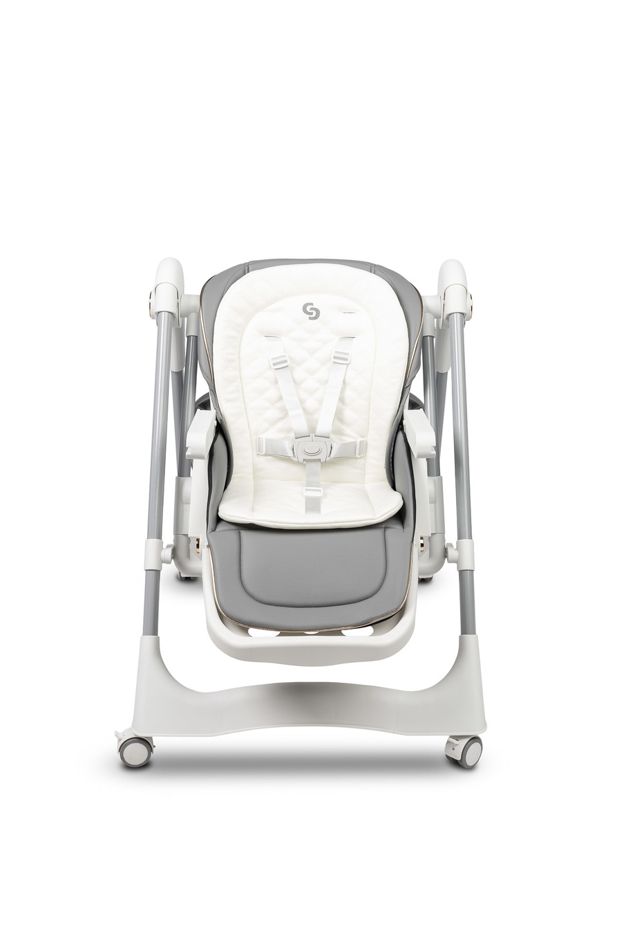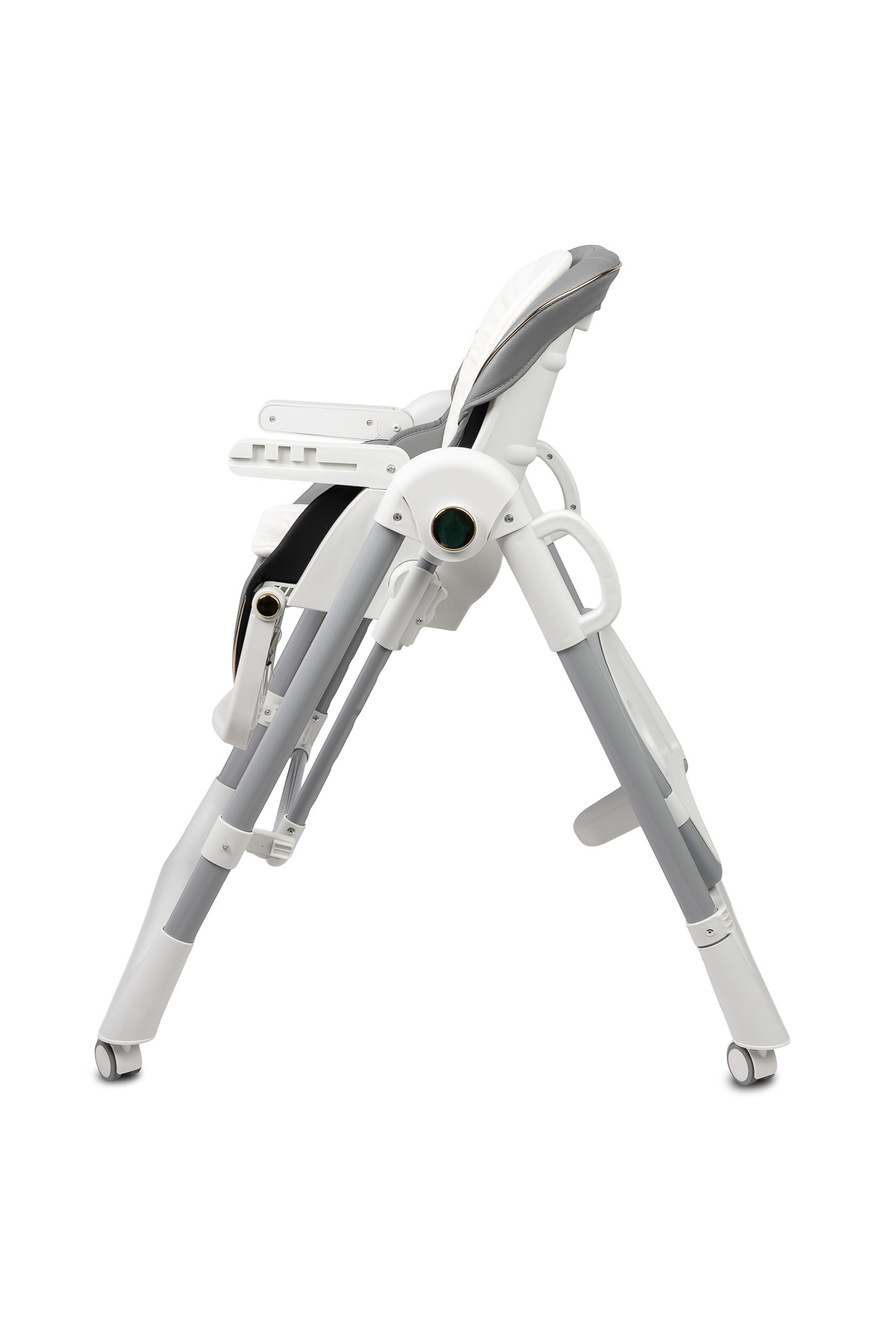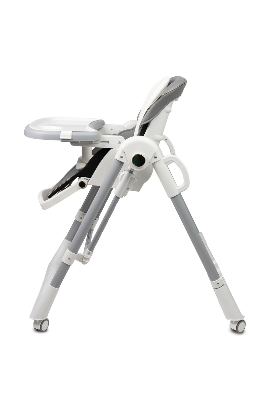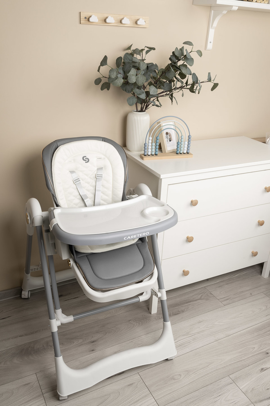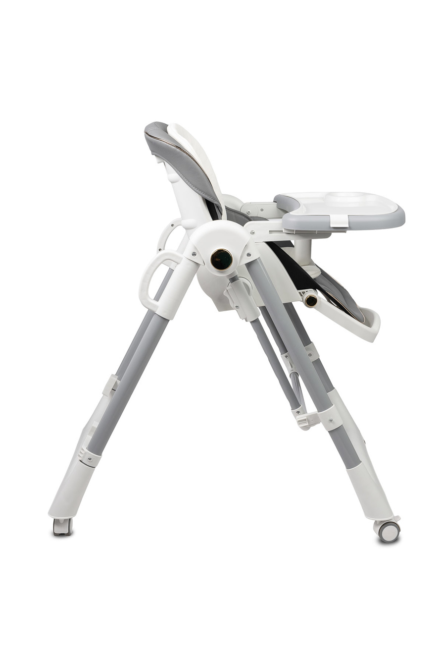 Krzesełko zostało wyposażone w 5-stopniową regulację wysokości, co umożliwia łatwe dopasowanie go do każdego stołu. Dodatkowo tacka odchyla się w 3 pozycjach względem siedziska, co znacząco zwiększa komfort dziecka podczas karmienia.