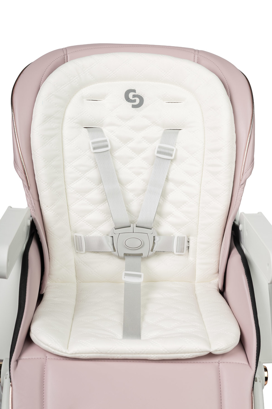 Tapicerka z ekoskóry zapewnia komfort użytkowania i łatwe czyszczenie – wystarczy przetrzeć powierzchnię wilgotną ściereczką, by usunąć codzienne zabrudzenia. Krzesełko zostało wyposażone w dodatkową, miękką poduszkę, zapewniającą idealne podparcie i wygodę podczas każdego posiłku. Demontowana wierzchnia warstwa tacki, którą można szybko zdjąć i dokładnie umyć – to idealne rozwiązanie dla utrzymania higieny po każdym posiłku.