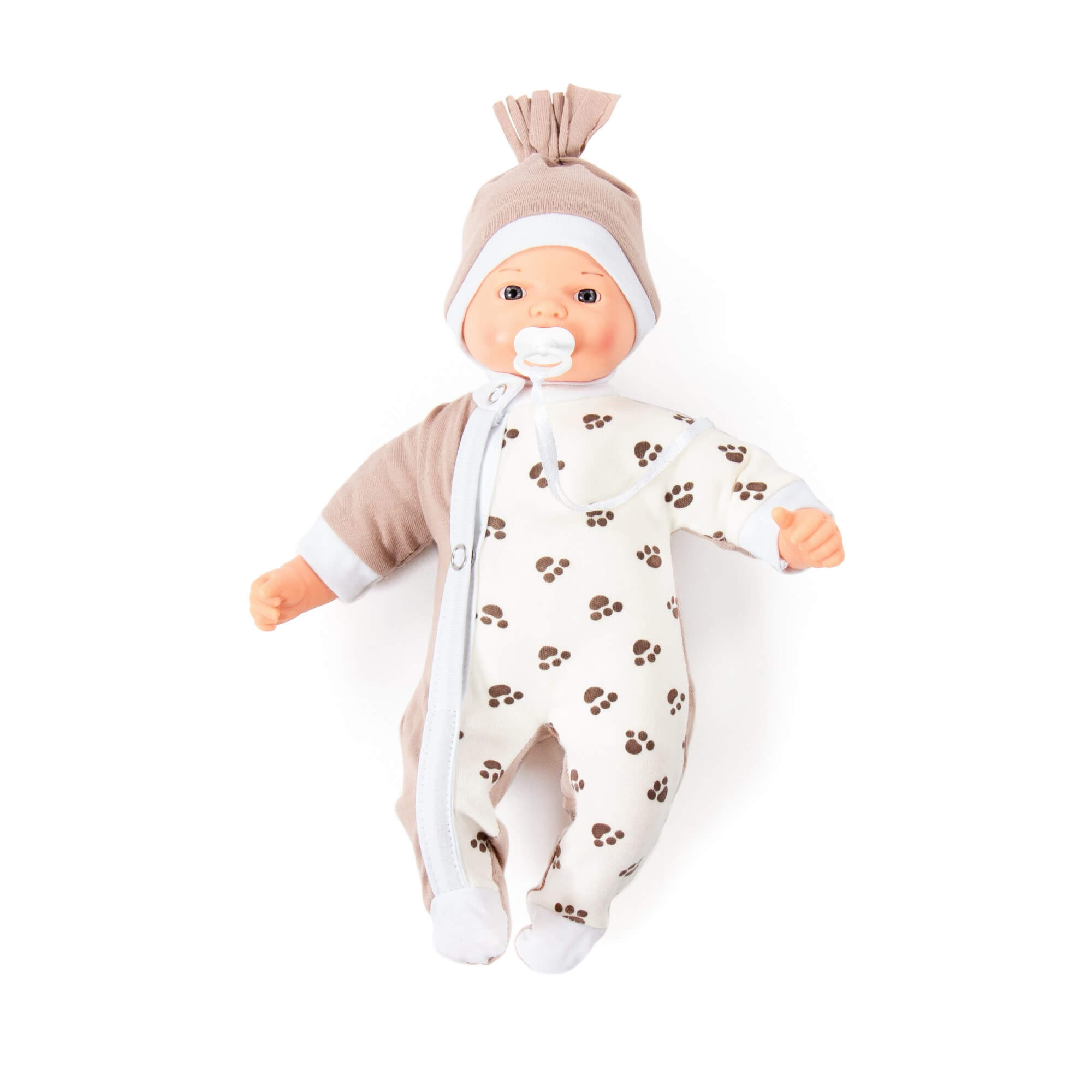 Lalka swoim wyglądem oraz funkcjonalnością przypomina prawdziwe niemowlę. Ubrana jest w śpioszki oraz czapeczkę dodatkowo posiada smoczek.