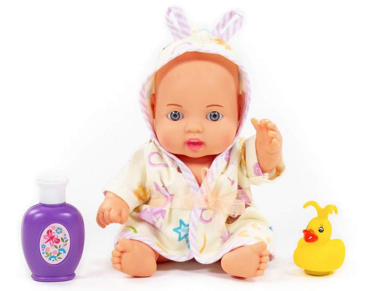 Laleczka ubrana jest w szlafrok z uszami, jak prawdziwe dziecko.