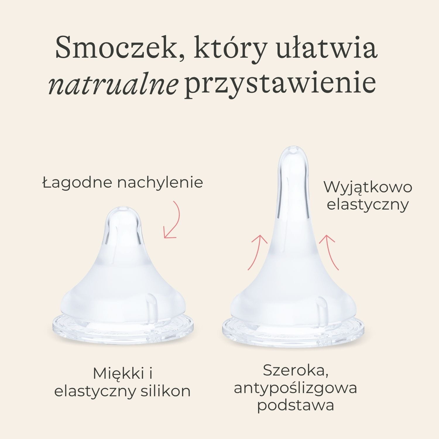 Zintegrowany system wentylacji zapobiega dostawaniu się powietrza, głównej przyczyny kolek podczas gdy specjalnie zaprojektowana końcówka smoczka pozwala dziecku kontrolować przepływ pokarmu co zapewnia komfortowe przyjmowanie pokarmu w jednostajnym tempie.