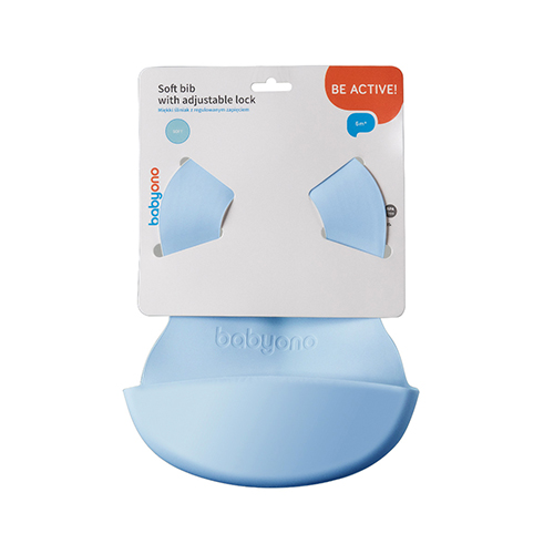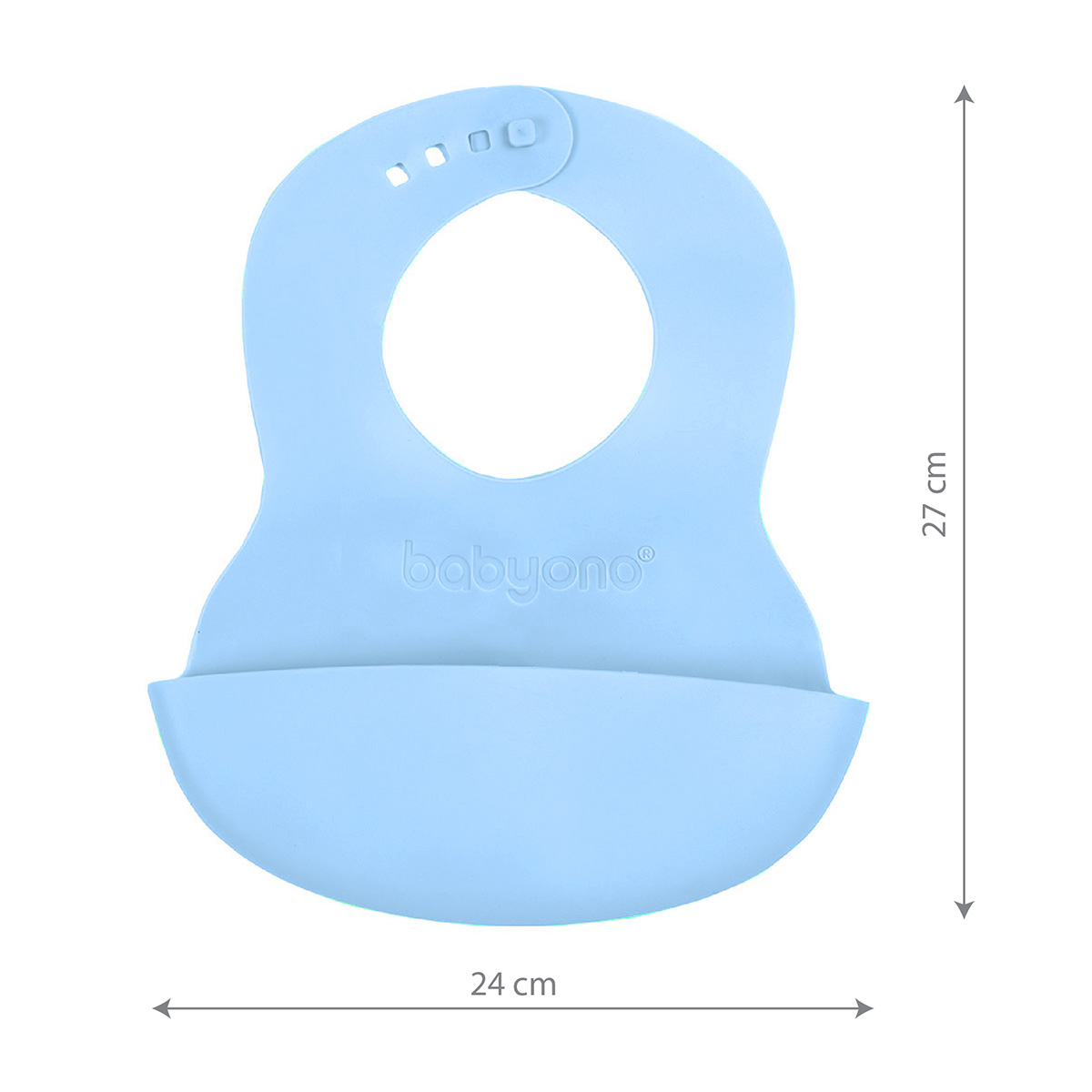 Miękki śliniak z regulowanym zapięciem BabyOno 835/05 błękitny silikonowy śliniaczek dla dziecka 6m+