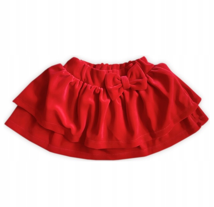 Śliczna rozkloszowana spódniczka w kolorze czerwonym. Z przodu ozdobiona czerwoną kokardą. W pasie wszyta praktyczna gumka, ułatwiającą ubieranie. Produkt zdobią dwie falbanki .