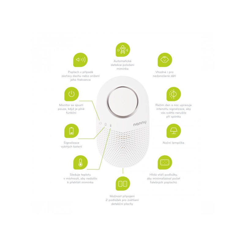 Nanny BM-03 to certyfikowany wyrób medyczny, który monitoruje oddech dziecka. Jest odpowiedni nawet dla wcześniaków o wadze 1 kg. Jako jedyny monitor na rynku rejestruje również wiek podkładki. Jeśli przekroczy już wiek swojej przydatności, ostrzeże Was o tym podczas automatycznego testu działania po włączeniu.