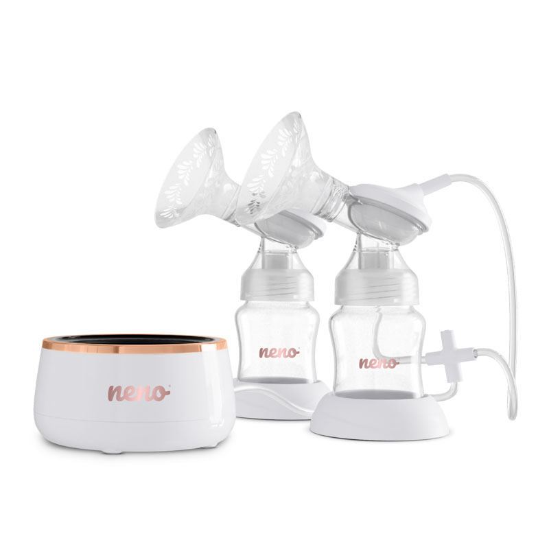 Zestaw, oprócz antykolkowych smoczków z osłonką, nakładek na butelki, lejków, butelek 150 ml i kabla USB-C, zawiera także dodatkowe akcesoria: dwa woreczki do mrożenia pokarmu oraz dwa egzemplarze wkładek laktacyjnych Neno Stella.