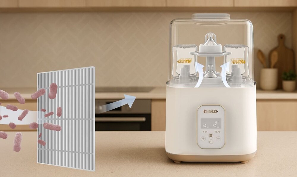 Podgrzewacz Neno Puro wyposażony jest w specjalny filtr, który oczyszcza powietrze trafiające do wnętrza urządzenia. Dzięki temu masz pewność, że butelki i akcesoria są suszone w warunkach maksymalnej higieny – bez kurzu, pyłków i drobnoustrojów.