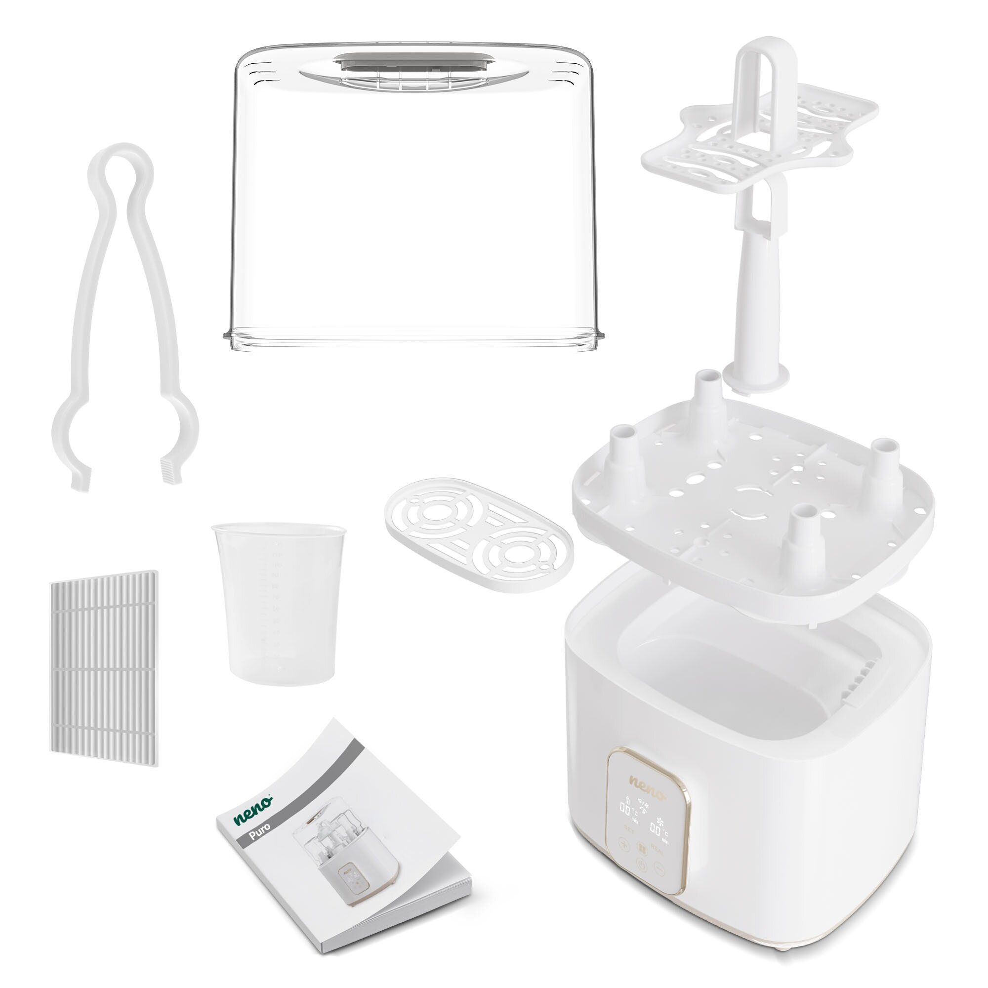 Podgrzewacz do butelek NENO ze sterylizatorem Puro 4w1, 1 x filtr, 1 x kubek, 1 x szczypce oraz dokumentacja.
