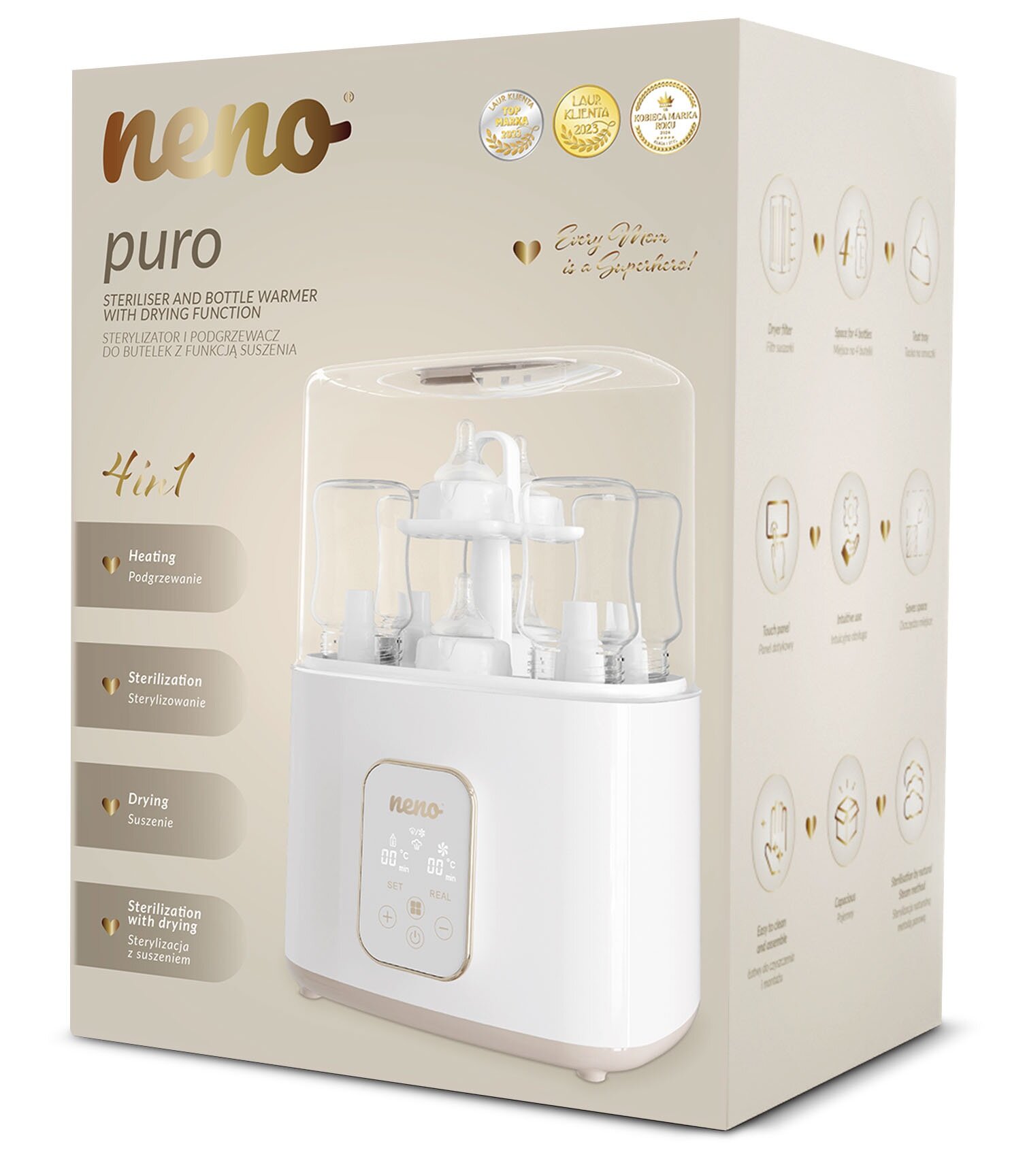 Podgrzewacz butelek wraz ze sterylizatorem Neno Puro to urządzenie, które dostosowuje się do Twoich potrzeb. Wybierz jeden z 4 programów urządzenia: sterylizacja, suszenie, sterylizacja z suszeniem lub podgrzewanie. Jeden produkt, wiele możliwości!