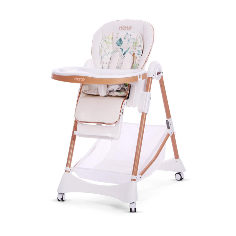 Krzesełko Neno posiada regulowany podnóżek, 5-punktowe pasy bezpieczeństwa, regulowaną tackę z podwójnym blatem, odchylane siedzisko z opcją zmiany wysokości. Do tego ma 4 koła z wygodną blokadą, łatwo się je składa a po złożeniu nie wymaga podparcia.