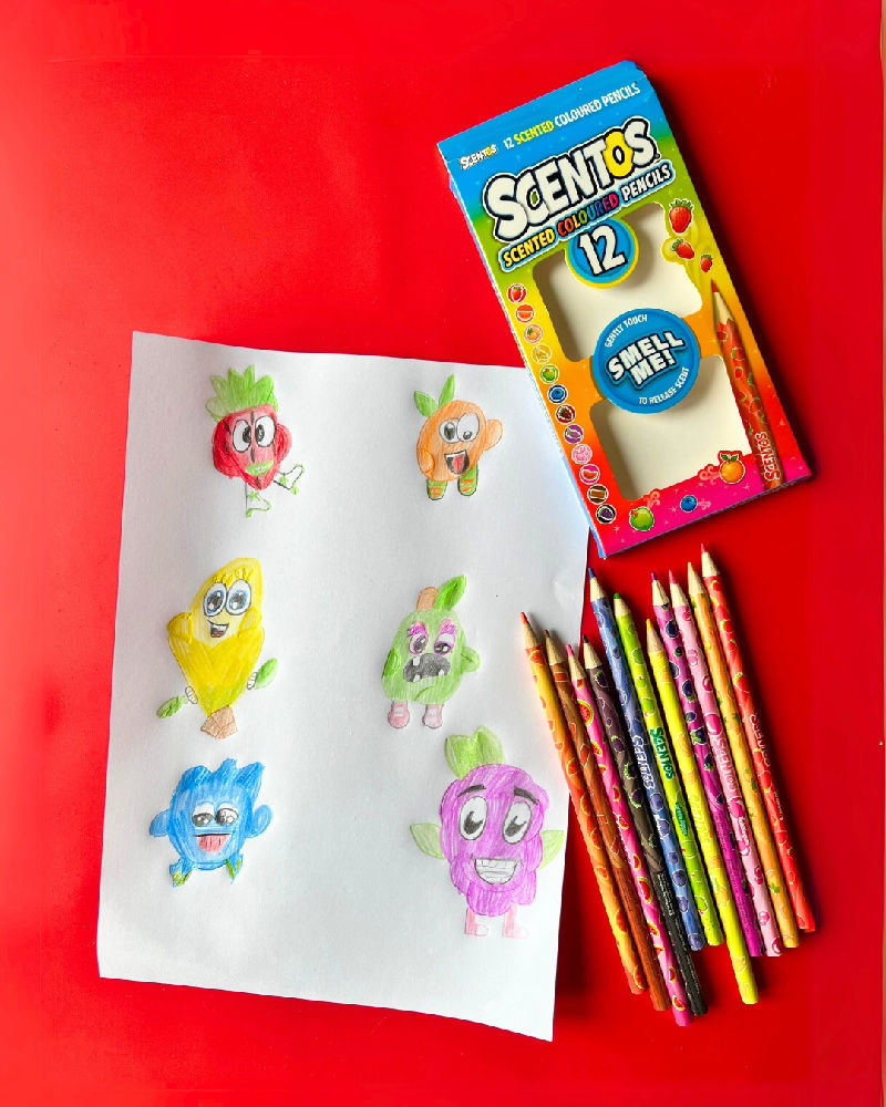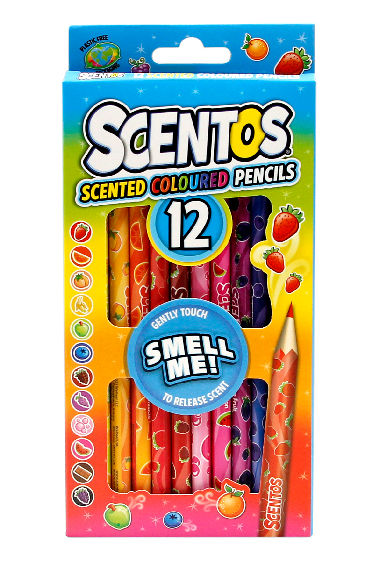 Owocowa eksplozja zapachu! Zestaw kryje w sobie dwanaście ołówkowych kredek, a każda z nich ma inny kolor. Poszczególnym kredkom odpowiada inny, słodki zapach, przywołujący na myśl owoce lub słodycze. O inspiracji zapachowej informuje nadruk na każdej z kredek.