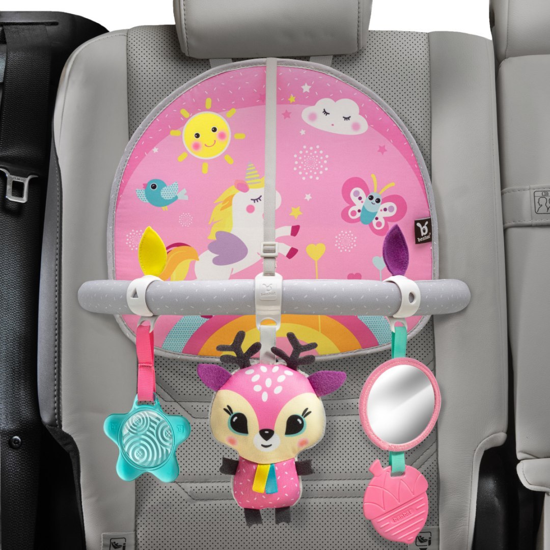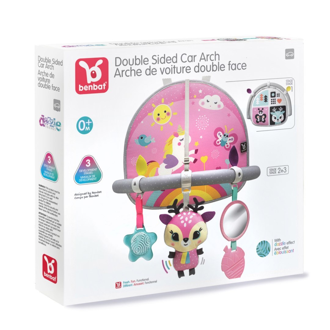 Dwuetapowy pałąk z zabawkami został zaprojektowany z myślą o podróżujących dzieciach tyłem do kierunku jazdy. Innowacyjny, wielofunkcyjny swoim wyglądem zachęci Malucha do zabawy. Pałąk jest dwustronny i wyposażony w zabawki rozwojowe, każda z własnym niepowtarzalnym wyglądem i stylem. Ciekawe kolory, różne struktury materiału, szeleszczące elementy rozwiną u dziecka najważniejsze w pierwszych etapach życia zmysły oraz koordynację wzrokowo ruchową. Kolorystyka jest pełna ekscytujących kolorów i dotykowych elementów, aby stymulować rozwój wszystkich zmysłów. Łatwy w montażu i demontażu, mocowany jest do tylnego zagłówka fotela samochodowego. Posiada pasek do regulacji wysokości i kąta zabawek. Pałąk jest idealnym produktem dla mobilnych rodziców, przemieszczających się samochodem z małym dzieckiem.