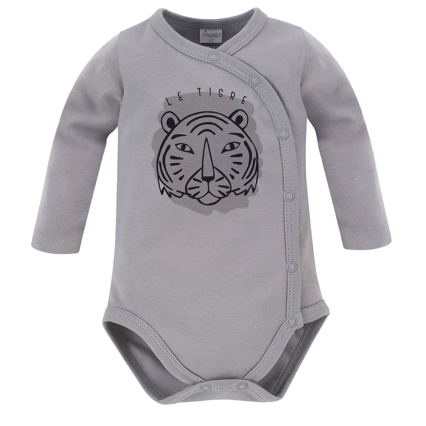 Świetne body niemowlęce Le Tigre, uszyte z przyjemnej w dotyku bawełny, to jeden z podstawowych elementów wyprawki malucha. Ma piękny, szary odcień, który pasuje praktycznie do wszystkiego. Aby nie było nudno, z przodu na wysokości klatki piersiowej umieściliśmy głowę tygrysa oraz napis w języku francuskim „Le Tigre”.