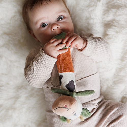 Zabawkę wzbogaciliśmy o elastyczny gryzak. Jest miękki i pokryty wypustkami, które zapewniają dodatkowe atrakcje sensoryczne. Piszczałka z gryzakiem to ukojenie dla podrażnionych dziąseł podczas wyrzynania się ząbków.