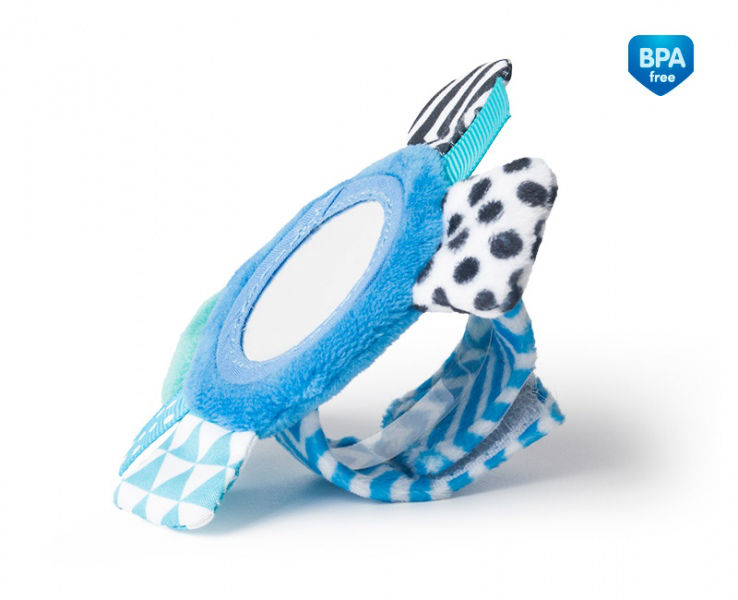 Kolorowa zabawka, przypinana na rączkę dziecka tak jak zegarek, zachwyci każdego malucha. Delikatna opaska idealnie dopasowuje się do małej rączki, a zapięcie na rzep zapobiega zgubieniu zabawki. Zabawka nie podrażnia delikatnej skóry dziecka.
